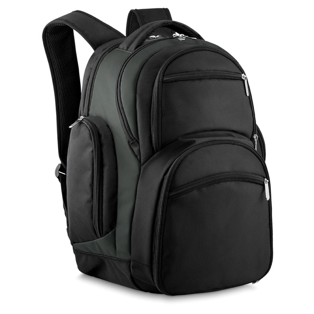 Descrição: Mochila poliester para notebook com detalhes em nylon e neoprene. Possui compartimento grande com bolso interno, compartimento médio com detalhe interno, dois compartimentos frontais pequenos, compartimento térmico e compartimento pequeno frontal. Mochila preta com detalhes cinza, possui dois bolsos laterais e alça revestida com espuma para um maior conforto.