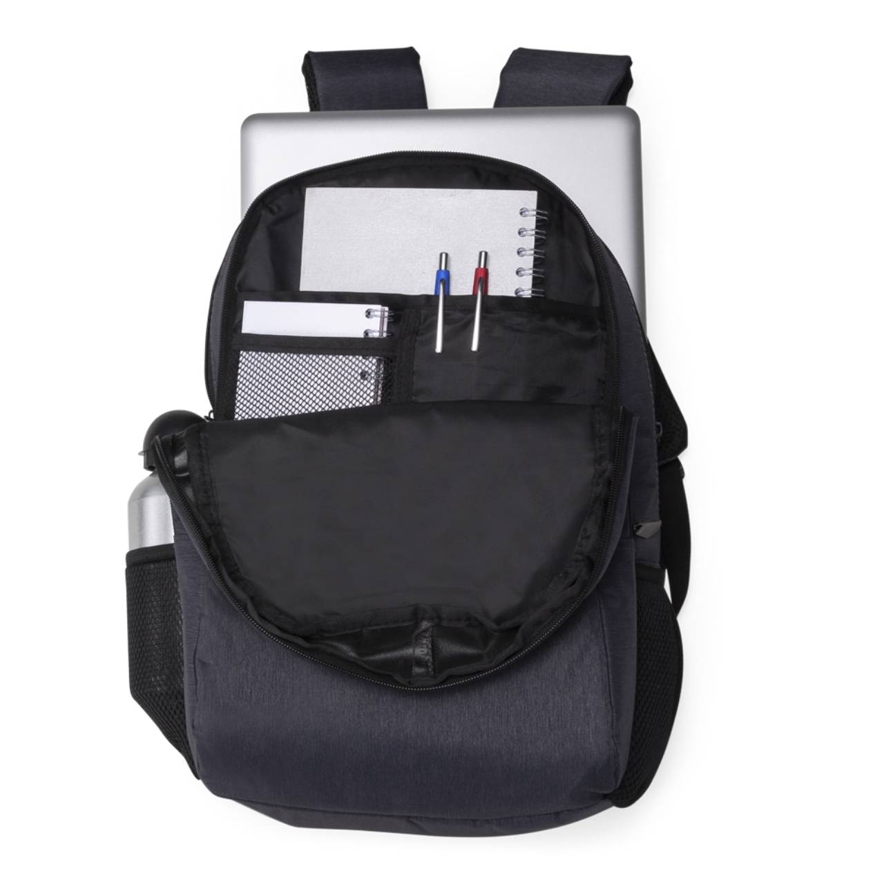 Descrição: Mochila confeccionada em poliéster com compartimento para notebook até 15,6 polegadas. Contém compartimento grande, compartimento mediano com divisórias e bolso telado, compartimento frontal e bolsos laterais em malha. Alça de mão com revestimento espumado, alças para as costas ajustáveis e com revestimento espumado.