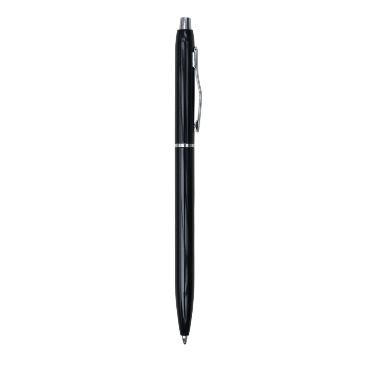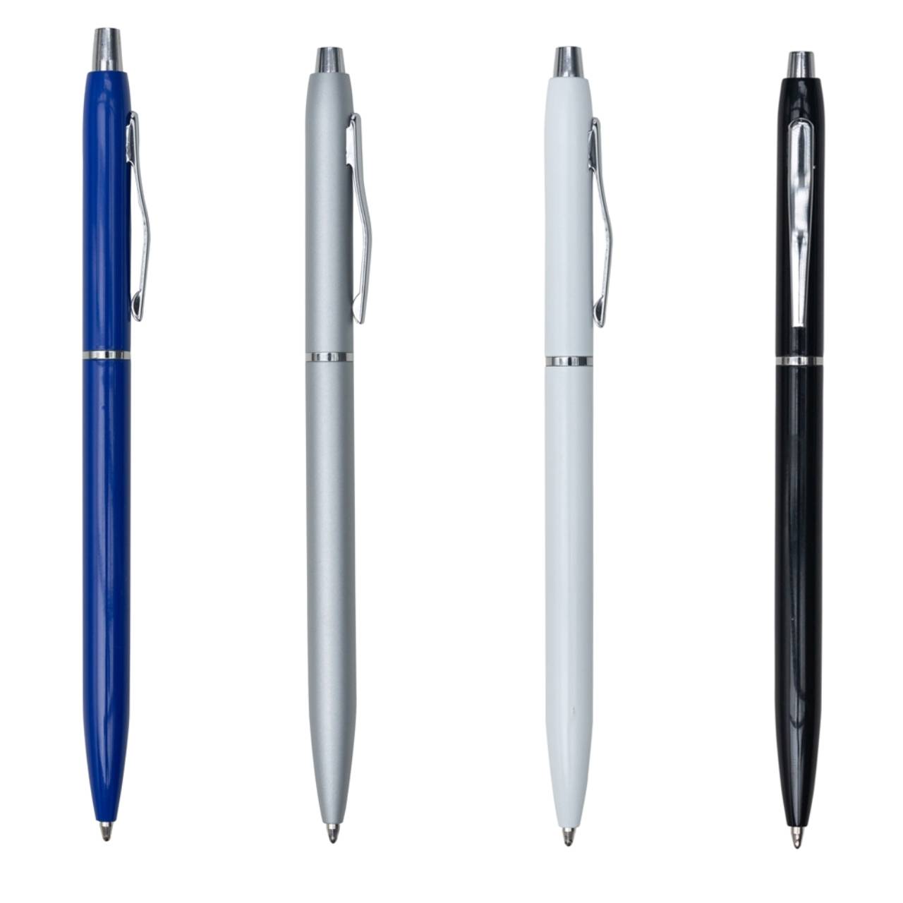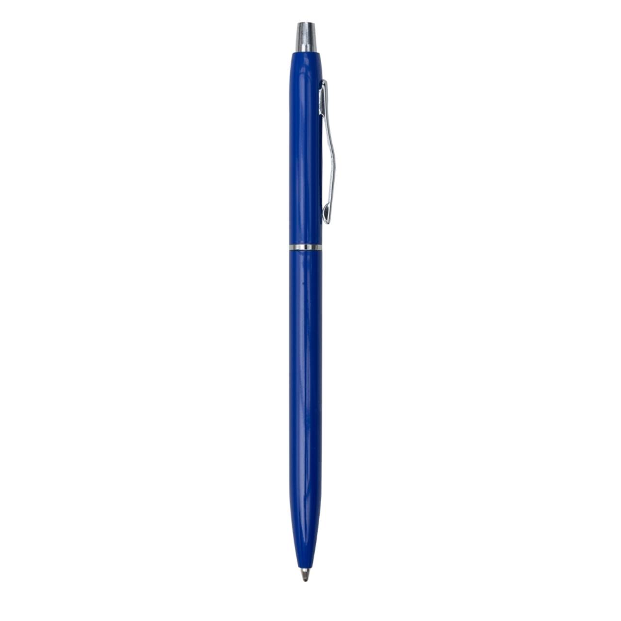 Descrição: Caneta metálica com carga esferográfica azul e acionamento por clique. OBS.: PEDIDO APENAS MÚLTIPLO DE 100 PEÇAS!