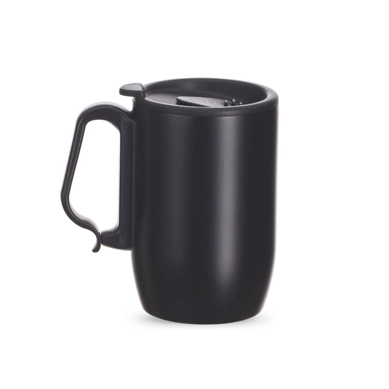 Descrição: Caneca inox 350ml com parede dupla. Possui tampa plástica com trava para abertura do bocal, alça plástica estilo mosquetão e base com apoio EVA. Obs.: Conserva temperatura.