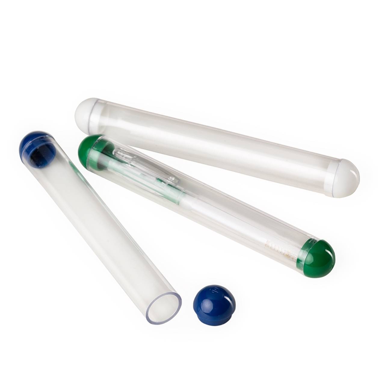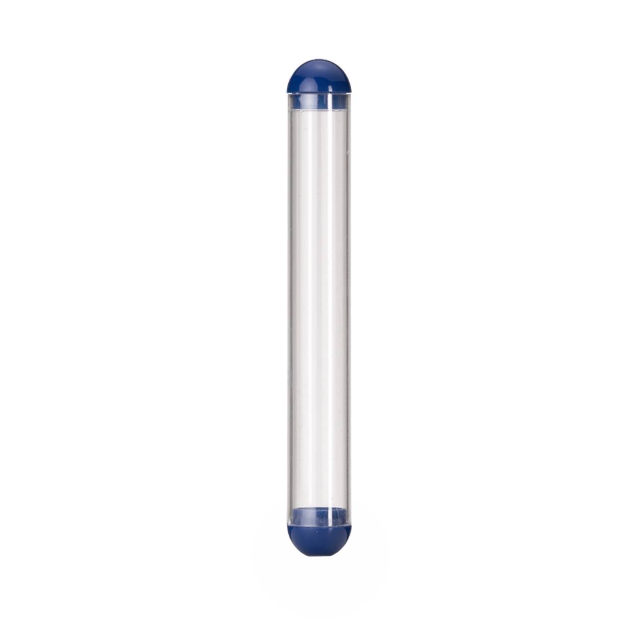 Descrição: Estojo plástico formato tubo compatível para uma caneta, possui tampas coloridas nas extremidades.