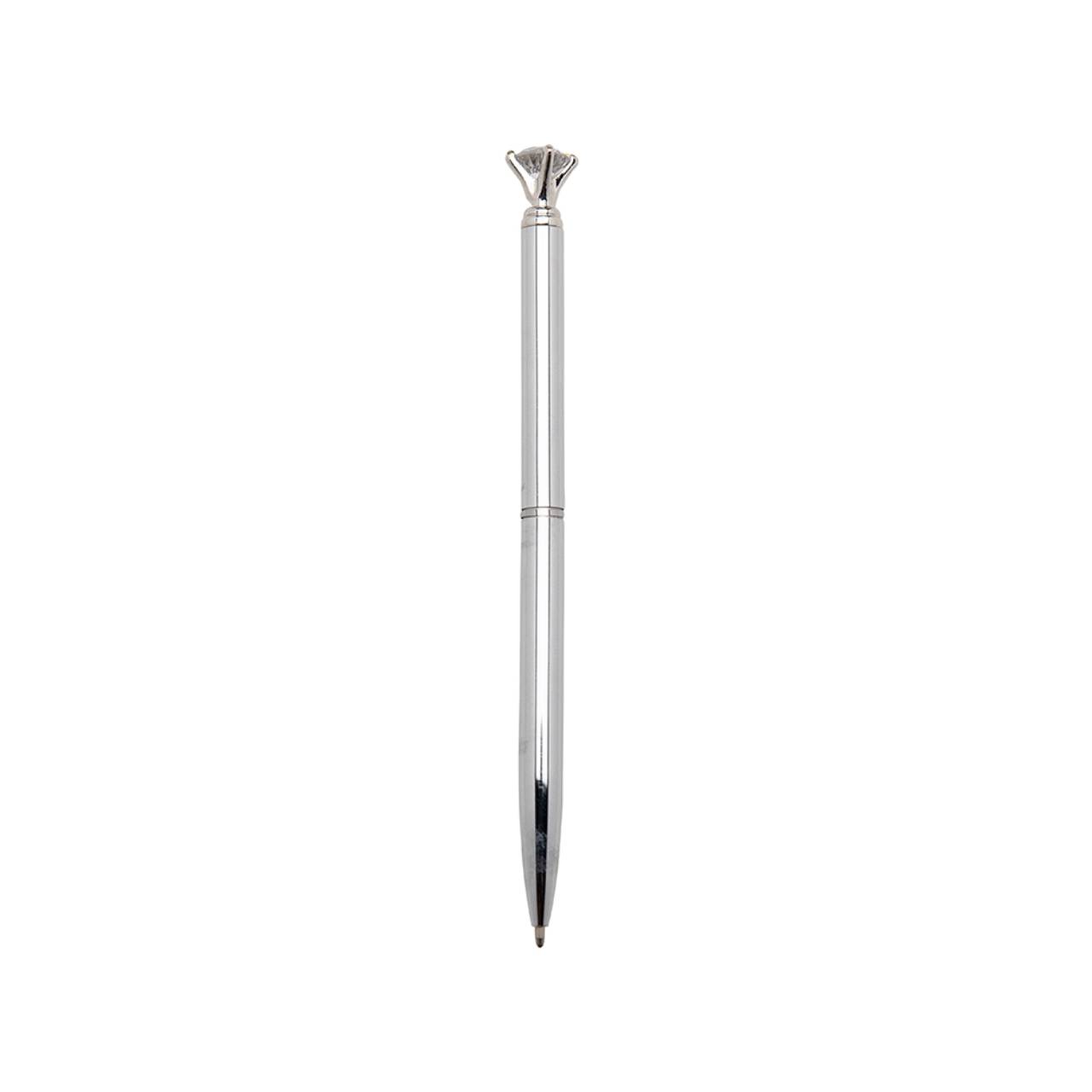Descrição: Caneta metálica com carga esferográfica azul e acionamento por rotação.