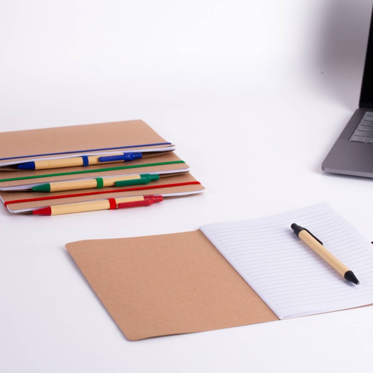 Descrição: Bloco de anotações ecológico com caneta de papel: Bloco de anotações com elástico e suporte para caneta, aproximadamente 30 folhas brancas com pauta, caneta com acionamento por clique.