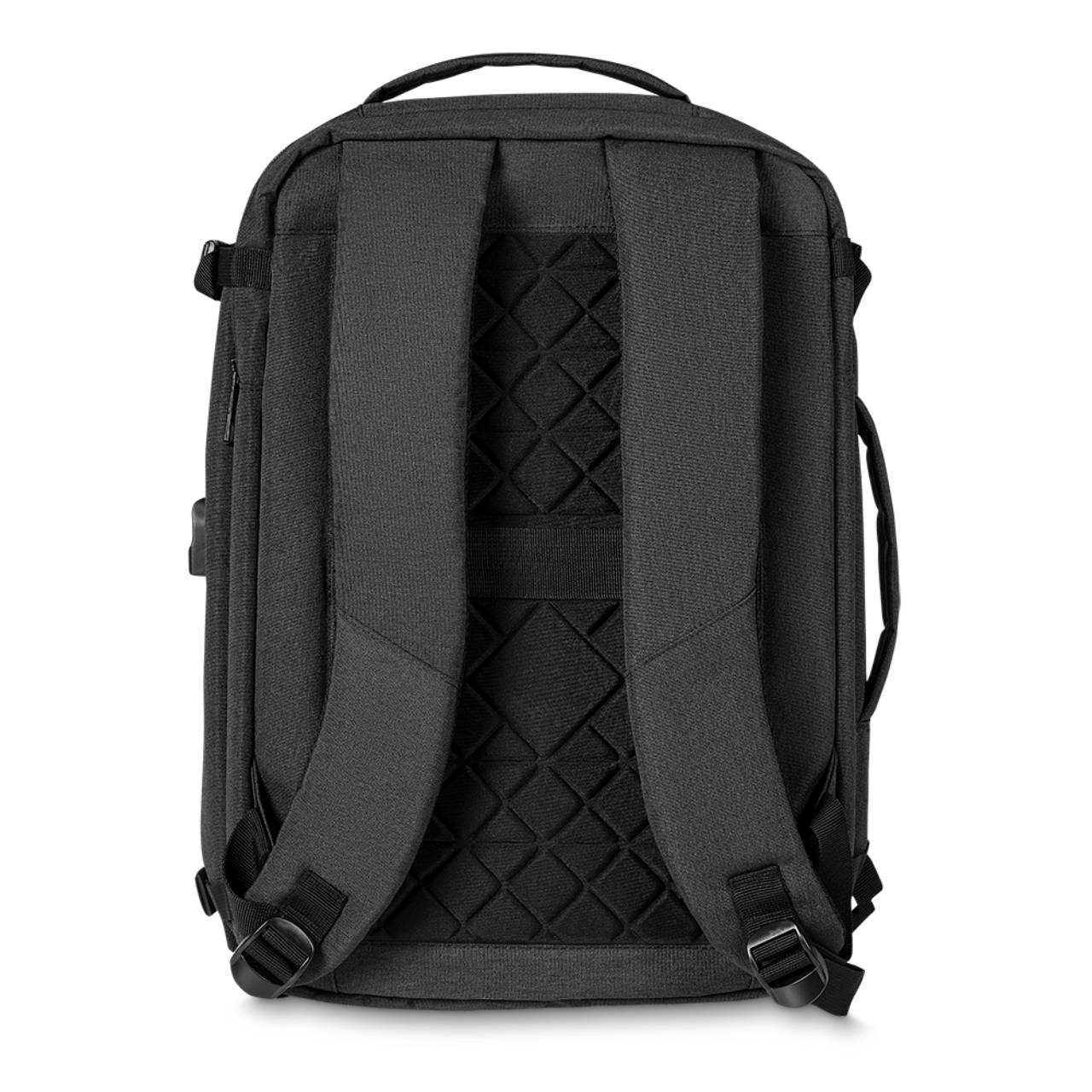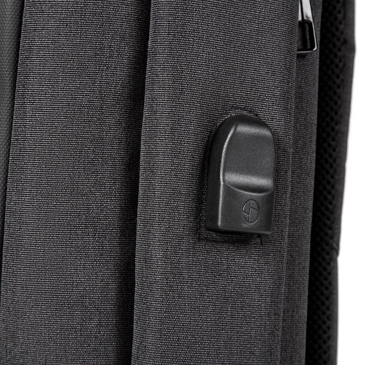 Descrição: Mochila confeccionada em poliéster com compartimento para notebook até 17 polegadas. Contém Dois compartimentos grandes sendo um com divisórias para documentos, eletrônicos e caneta, e um com divisória para Notebook até 17 polegadas. Compartimento frontal com abertura vertical. Tecido Impermeável. Alça traseira para conter as alças de ombro. Adaptador USB externo com cabo acoplado, permitindo a conexão de um carregador portátil de dentro da mochila e transferência da carga para o lado externo, ocultando o carregador e viabilizando a utilização do celular durante o processo. Contém zíperes com pegadores metálicos, alça de mão em nylon, alças para as costas ajustáveis com revestimento espumado antitranspirante e alça lateral que possibilita que a mochila seja carregada como uma pasta