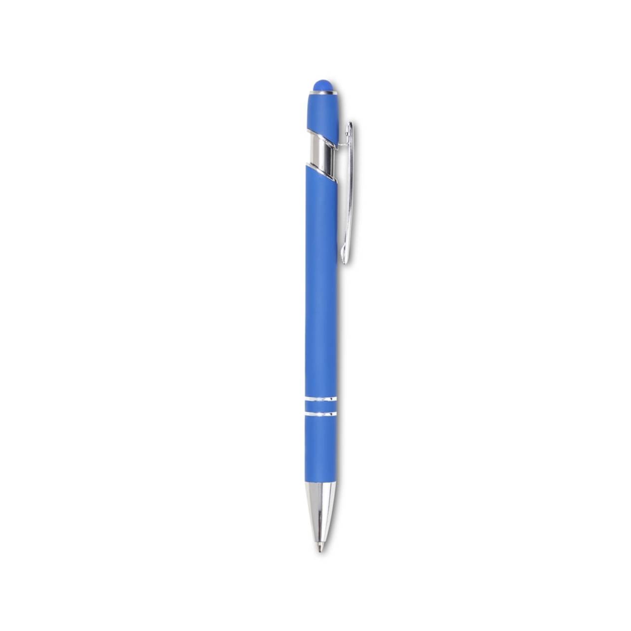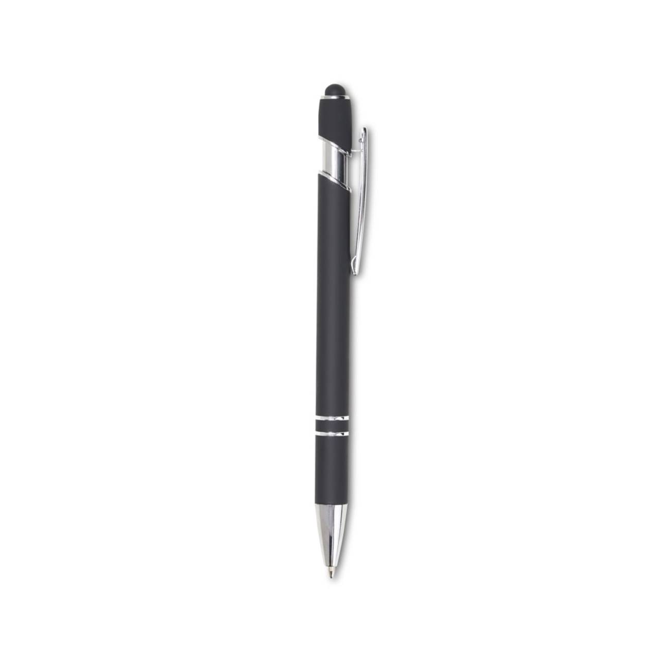 Descrição: Caneta touch screen metálica com acabamento inteiramente emborrachado, carga esferográfica azul e acionamento por clique.