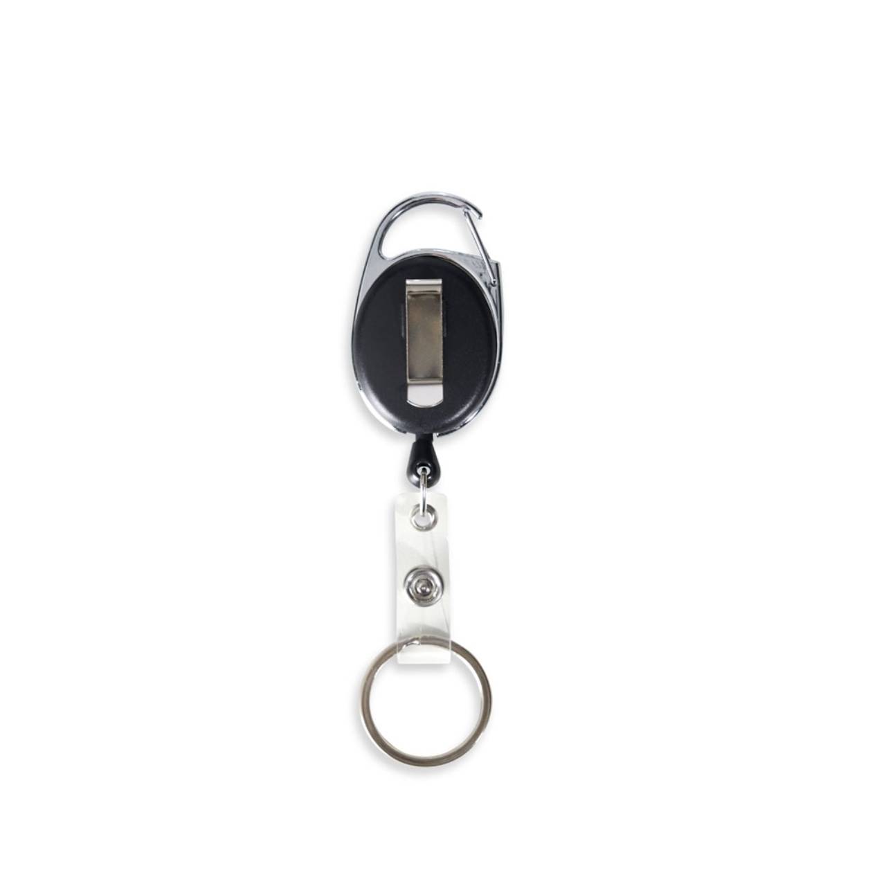 Descrição: Chaveiro estilo mosquetão retrátil com porta crachá. Feito de metal e PVC. Acompanha argola em inox para chaveiro e suporte transparente para crachá com botão de pressão. Possui um clip atrás para pendurar.