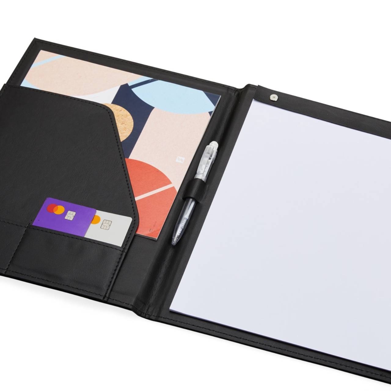Descrição: Pasta convenção de couro sintético, possui porta caneta, compartimento para arquivar documentos, dois bolsos para cartões e um bloco com aproximadamente 25 folhas brancas não pautadas.