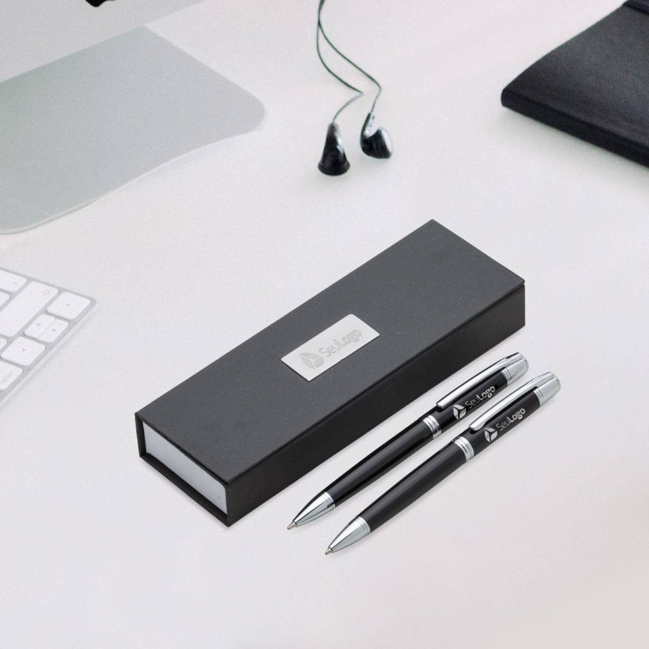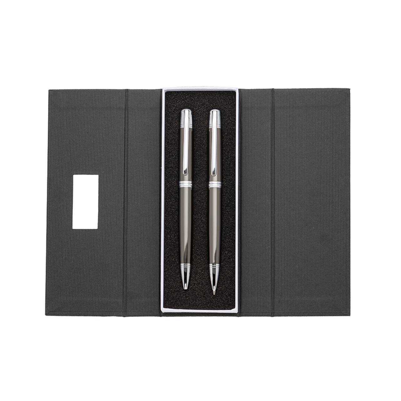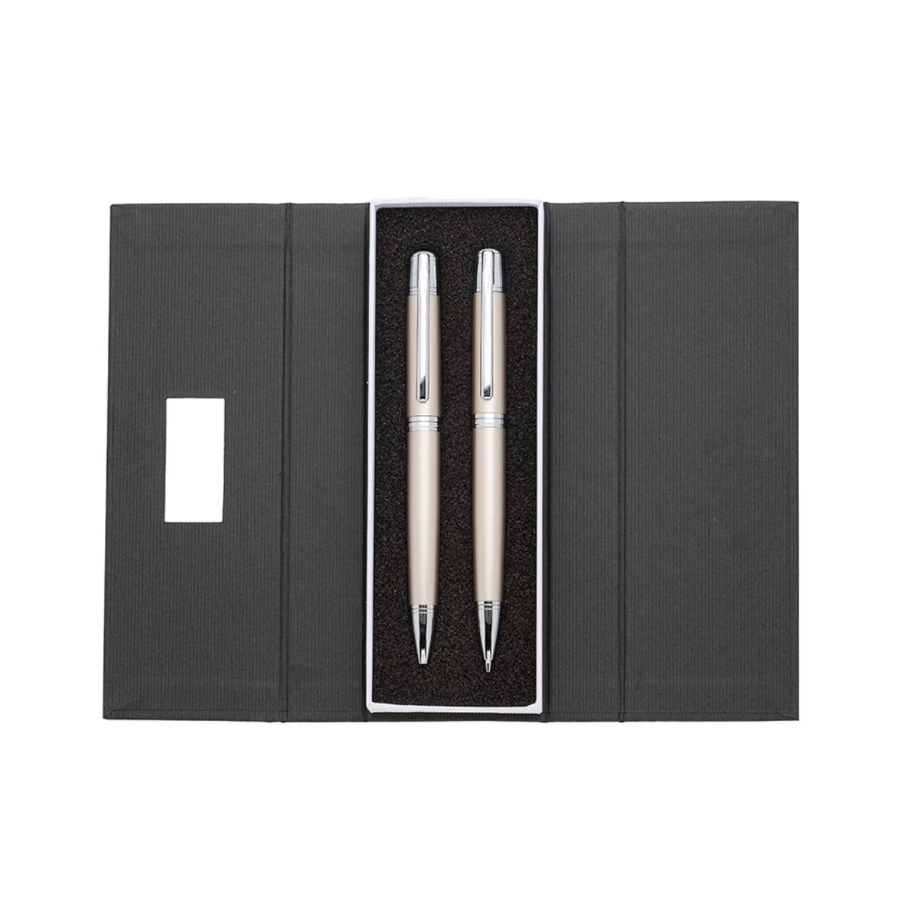 Descrição: Conjunto caneta e lapiseira em estojo de cartonagem com placa central para personalização. Clip metal com dois anéis em relevo, anel centralizado e dois anéis em relevo na ponteira e acionam por giro. Estojo revestida com espuma na parte interna.