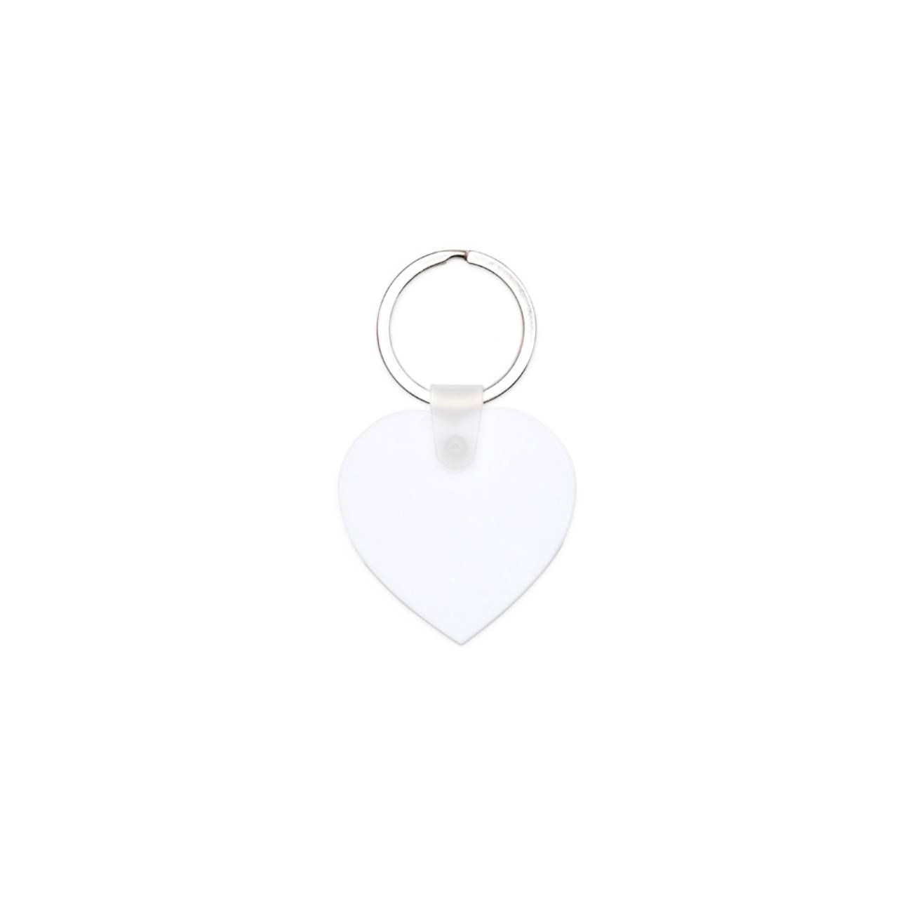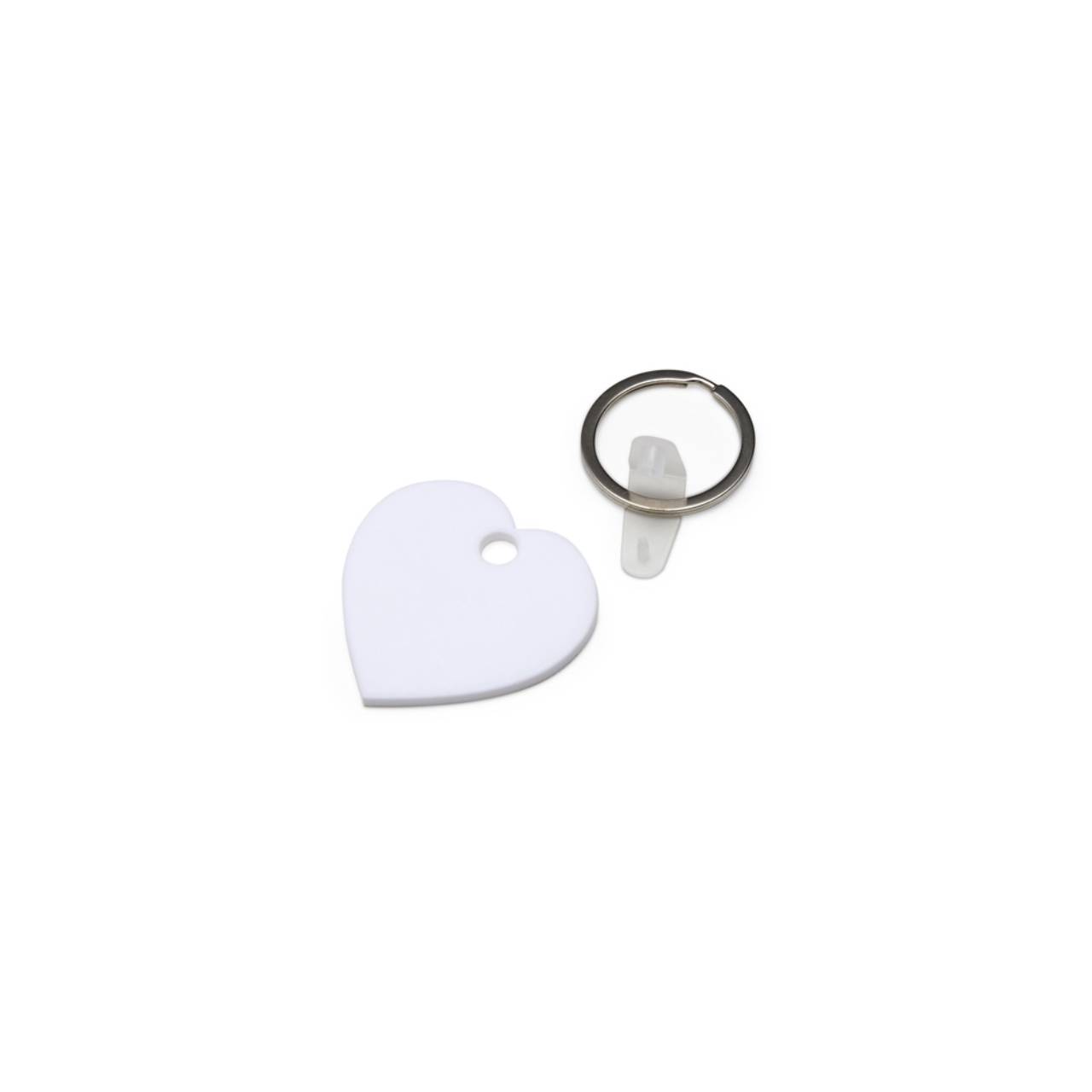 Descrição: Chaveiro de acrílico em formato de coração, frente verso e liso. Possui prendedor de plástico que conecta a argola metálica.