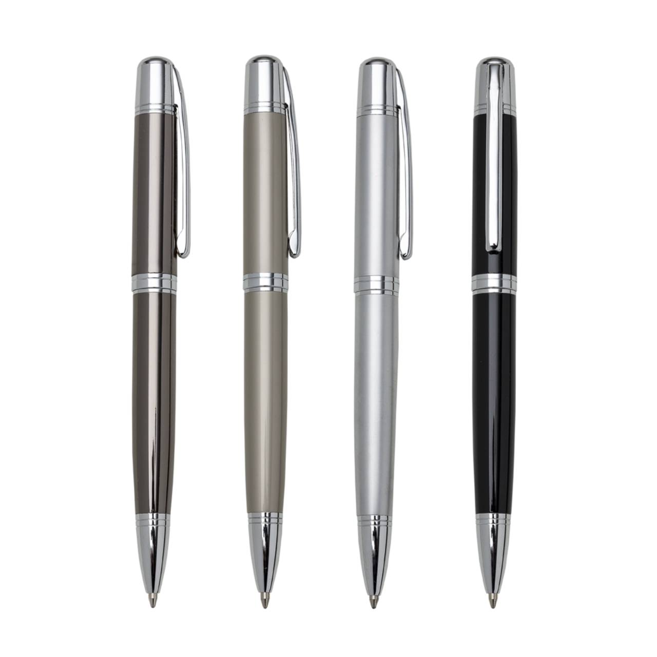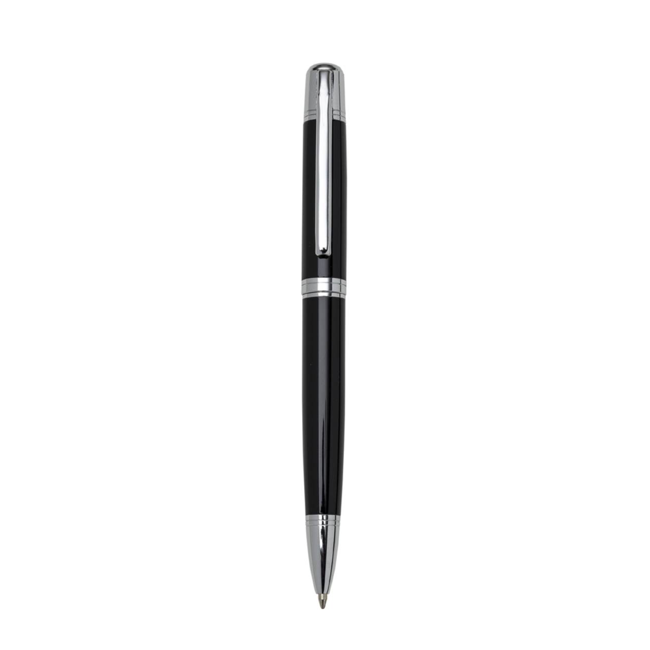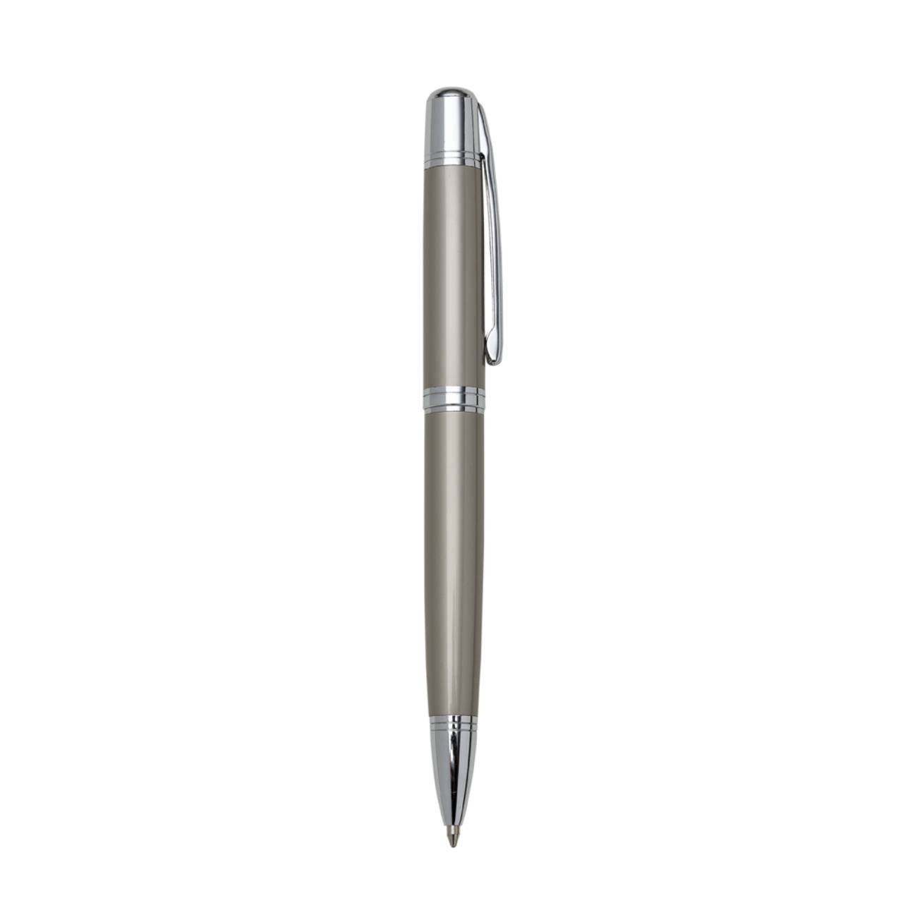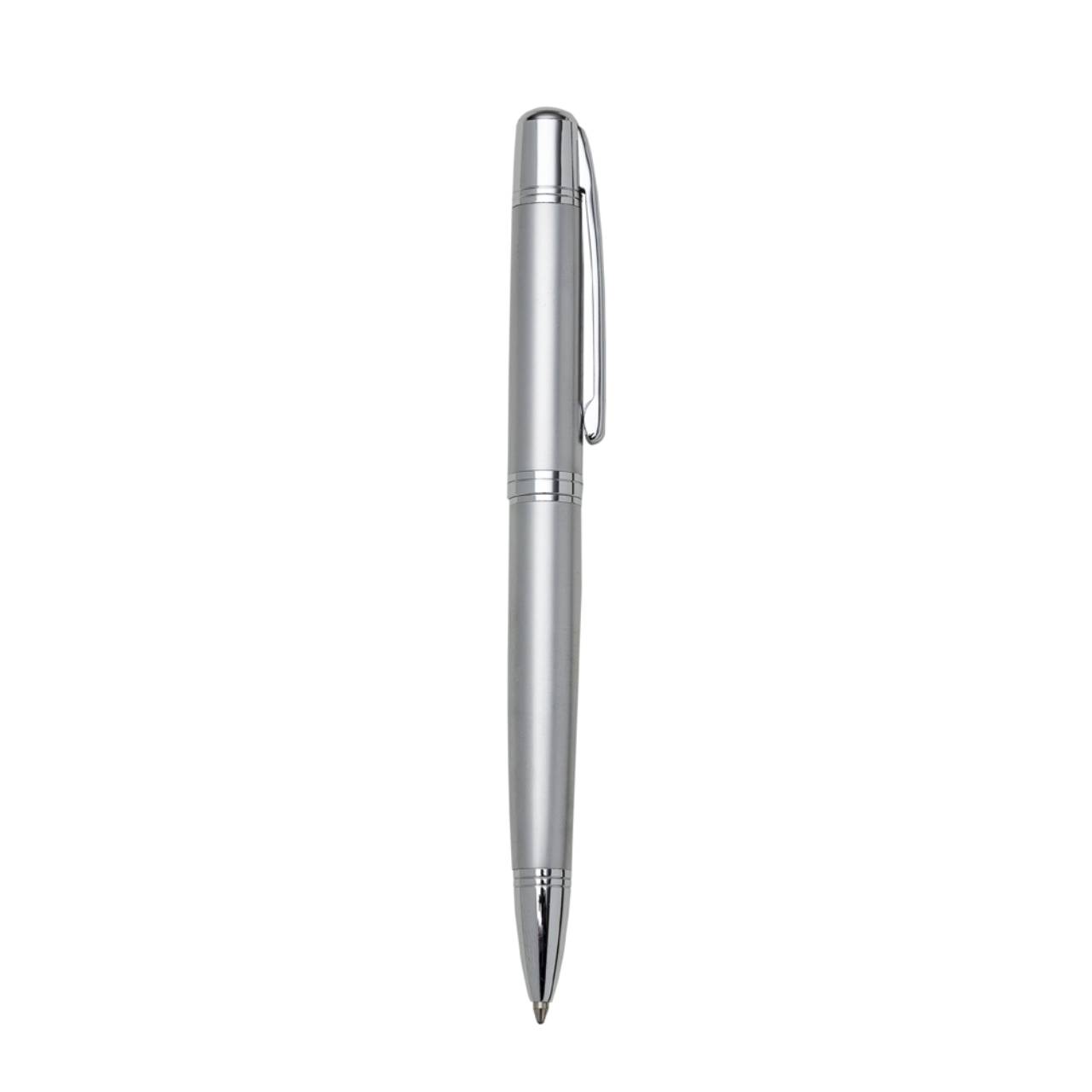 Descrição: Caneta metálica com carga esferográfica azul e acionamento por rotação.