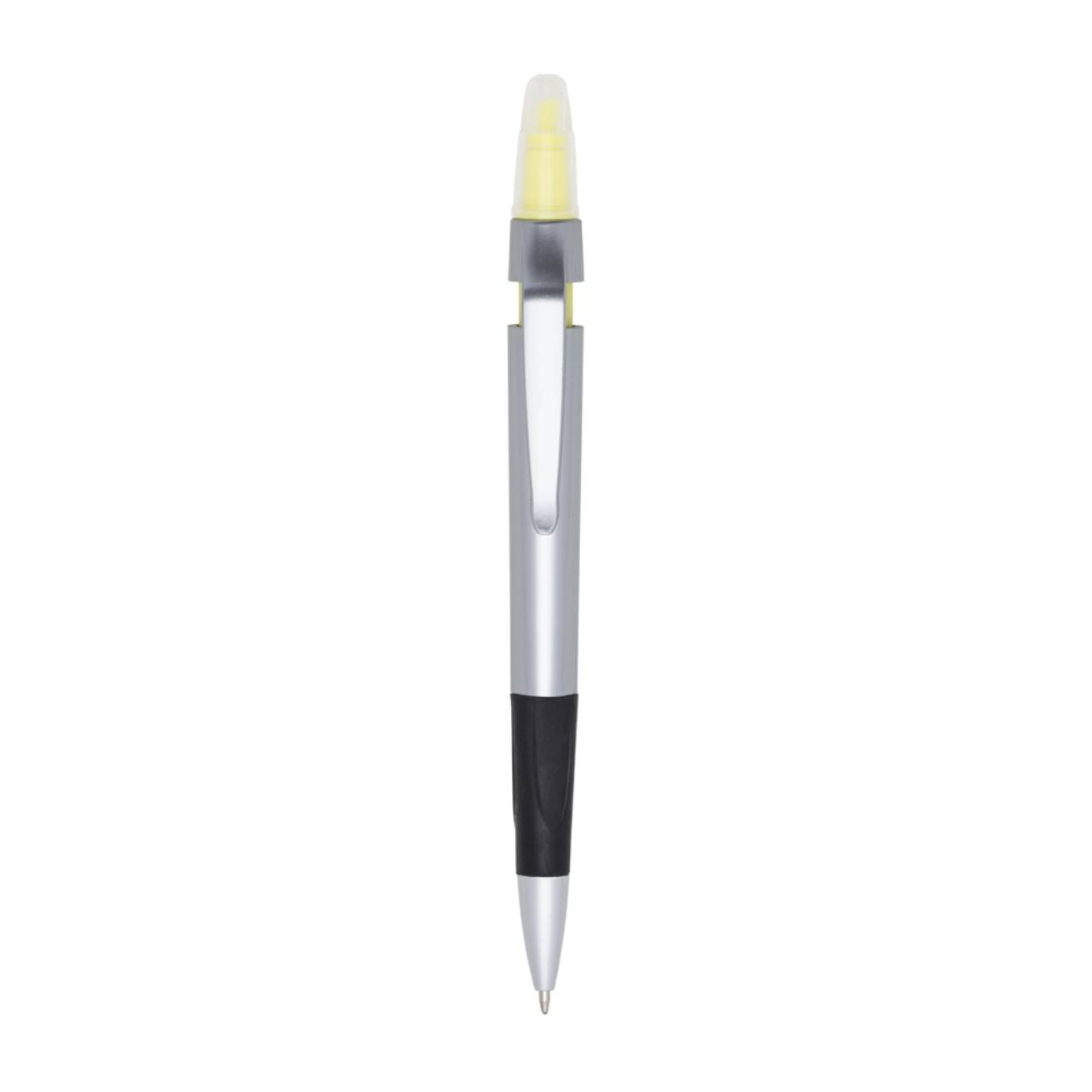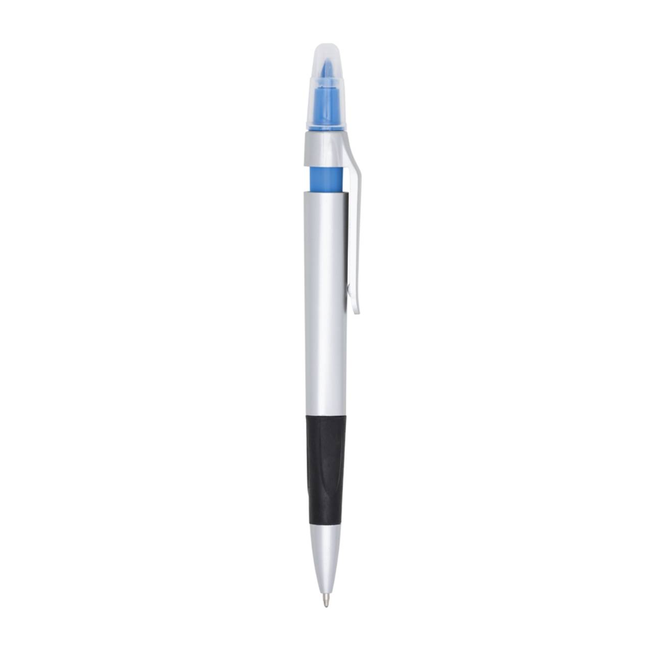 Descrição: Caneta plástica com marca texto, contém detalhe emborrachado e tampa protetora para o marca texto. Carga esferográfica azul e acionamento por clique.
