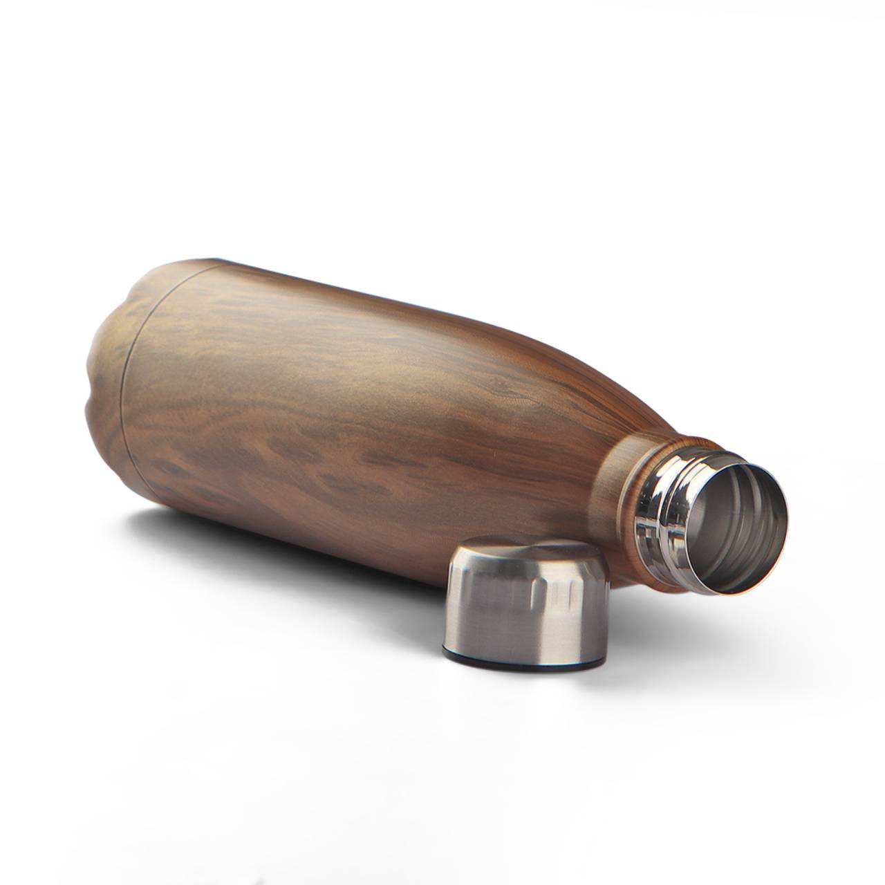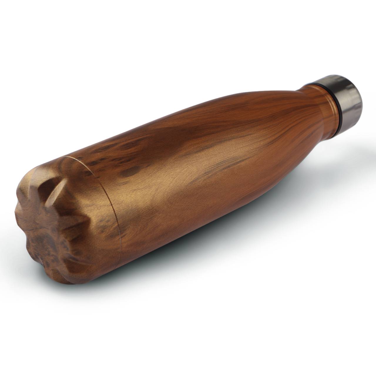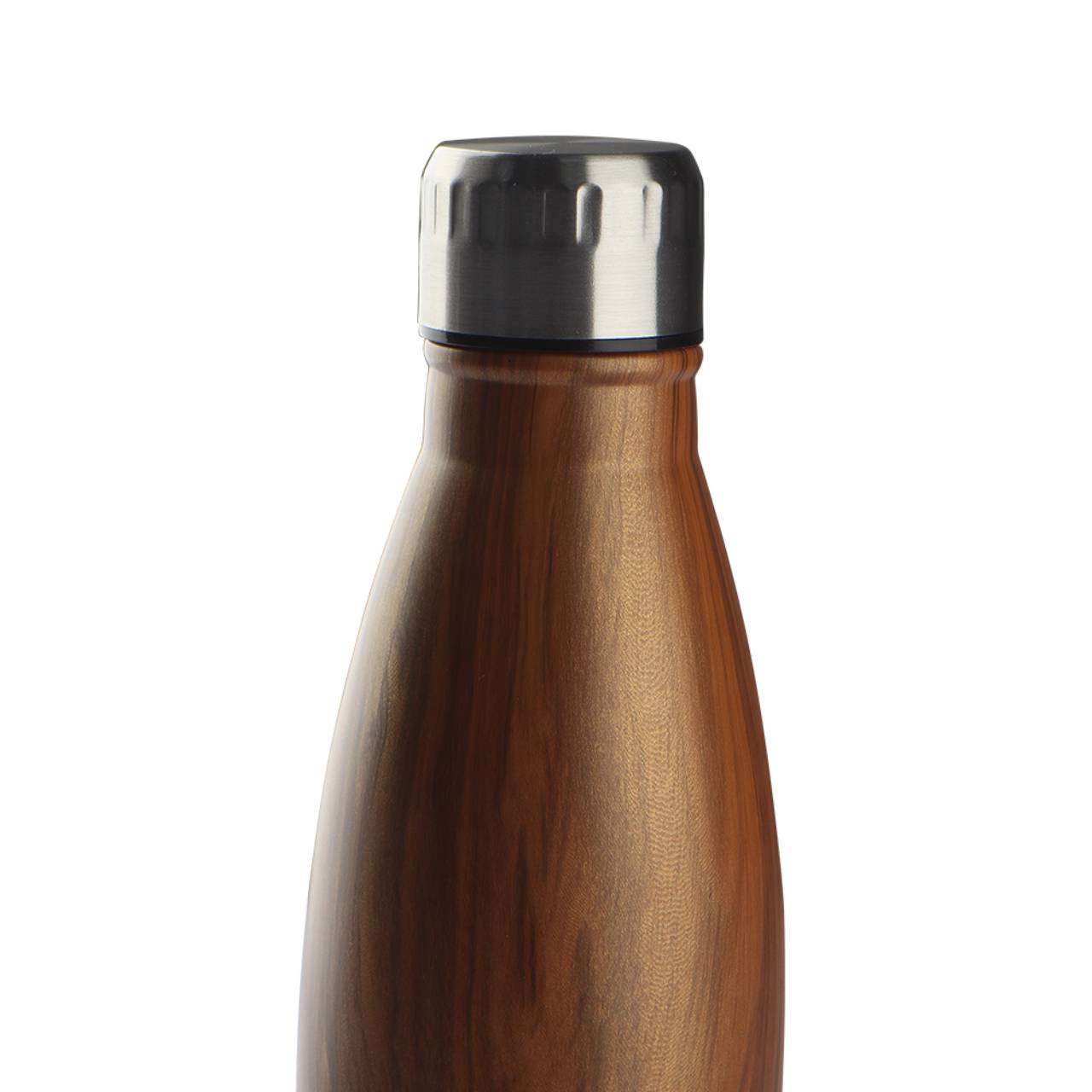 Garrafa em aço inox com capacidade de até 750 ml com textura imitação madeira. Tampa rosqueável e anel de silicone para vedação. Design com uns frisos na tampa.