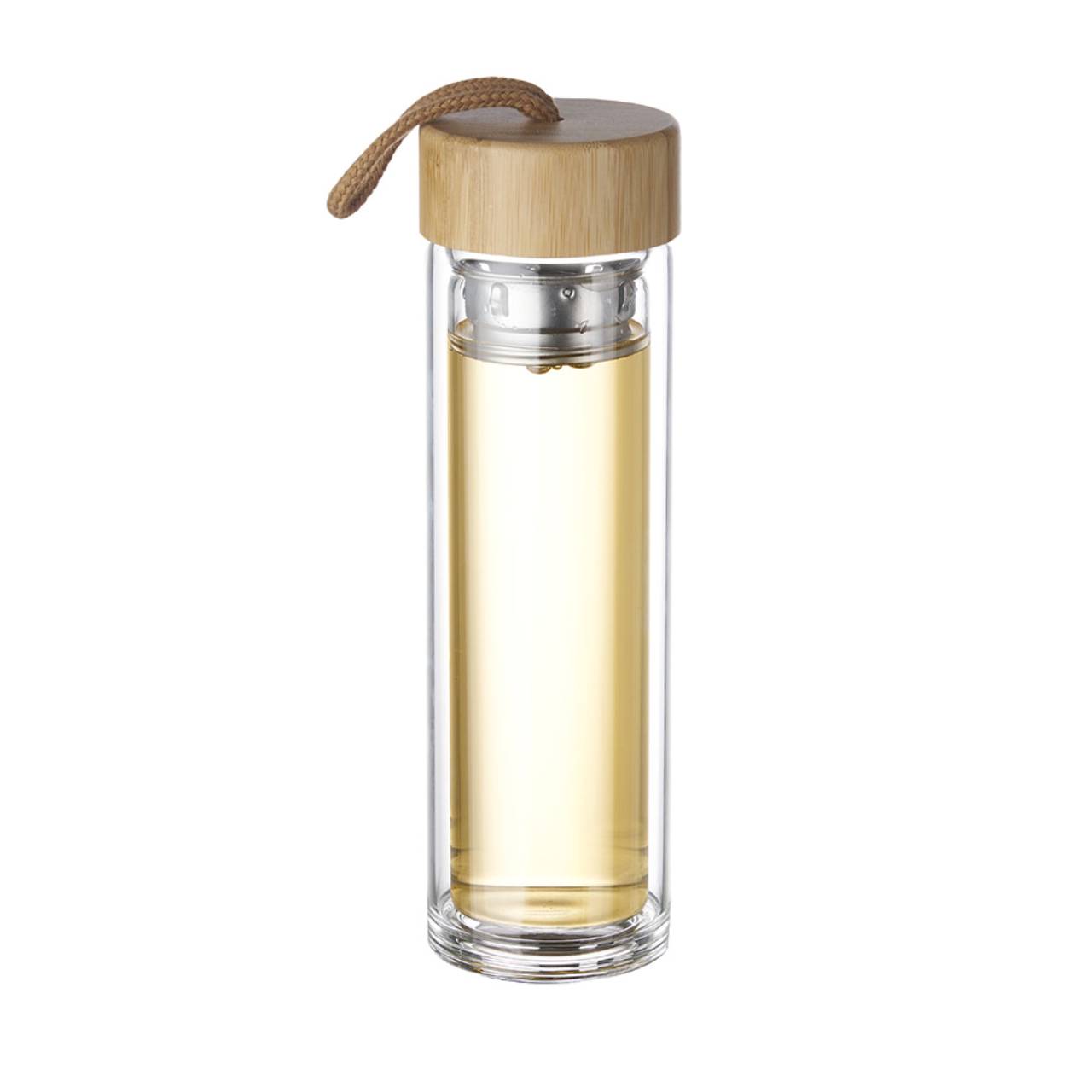 Garrafa de vidro borossilicato com parede dupla e capacidade de até 360 ml com infusor. Tampa rosqueável em bambu com anel de silicone para vedação e alça tipo corda. Conserva líquido quente por até 2 horas e líquido frio até 3 horas.