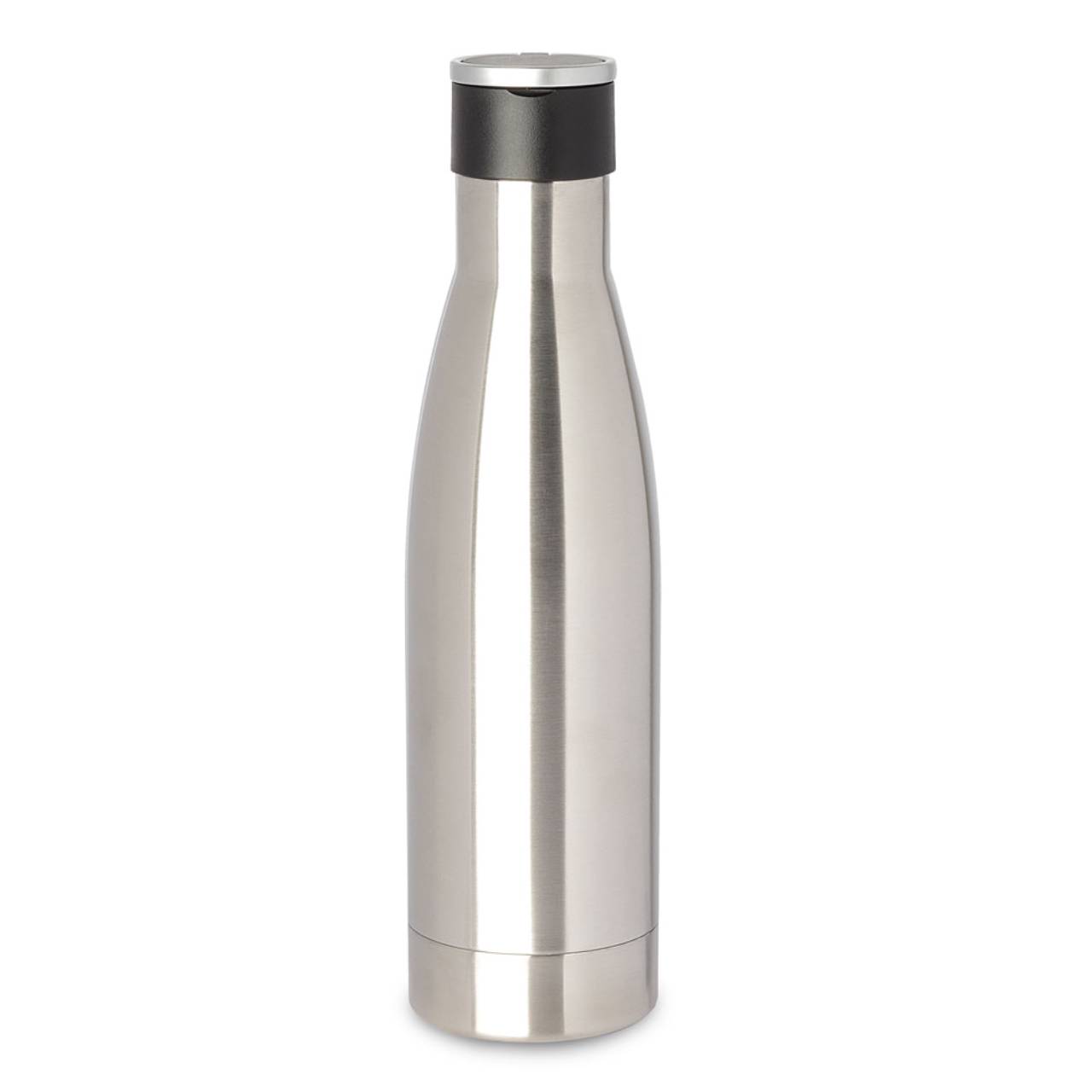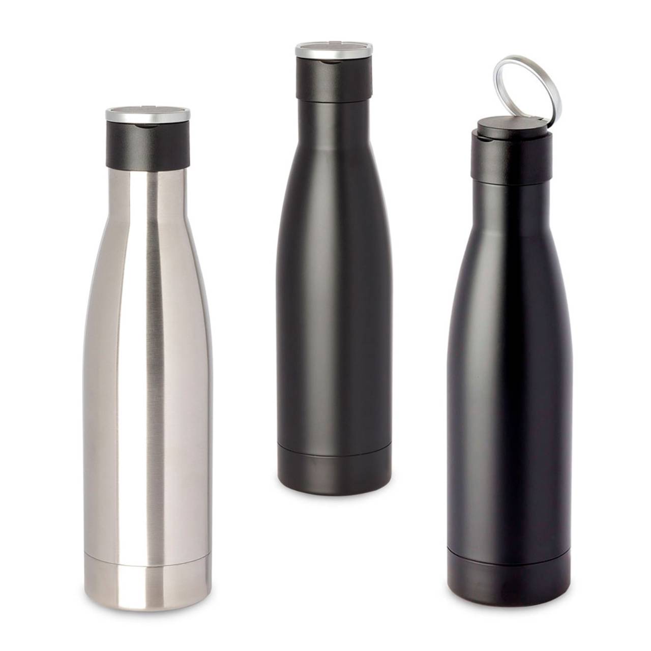 Garrafa térmica em aço inox isolada a vácuo com parede dupla, tampa de plástico com alça de transporte de aço inoxidável. Com capacidade de até 500ml.