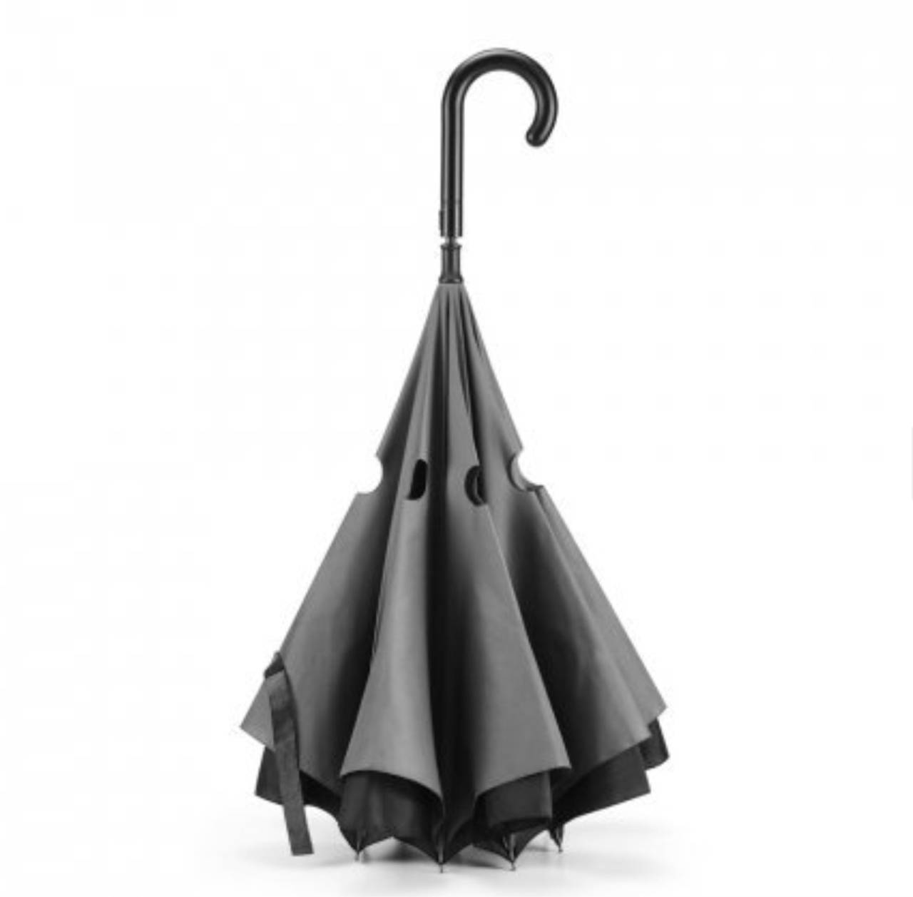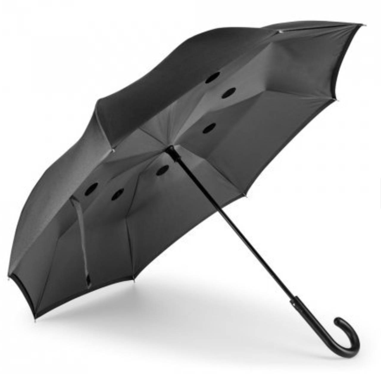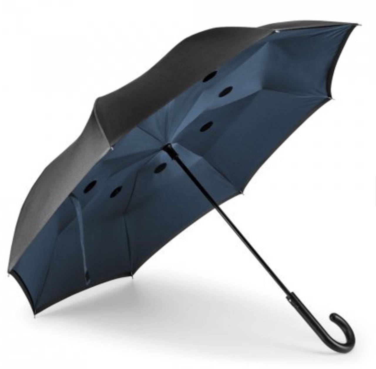 Guarda-chuva reversível em pongee 190T com capa dupla, cabo em metal e varetas em fibra de vidro. O guarda-chuva de estrutura patenteada tem abertura manual e fecho automático. ø1050 mm | 790 mm