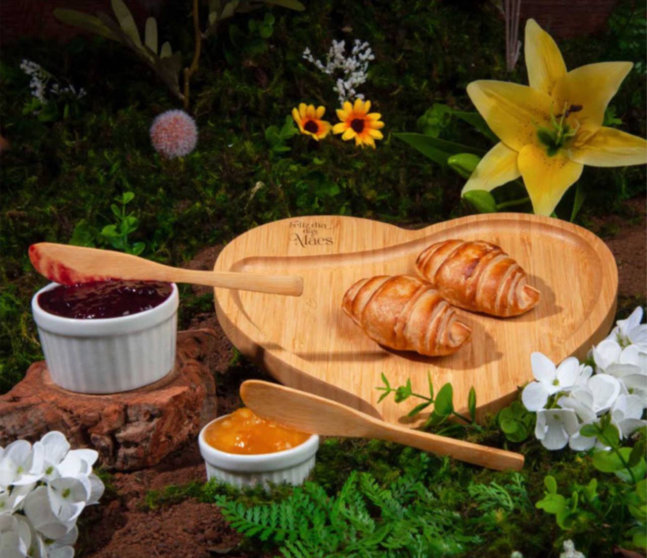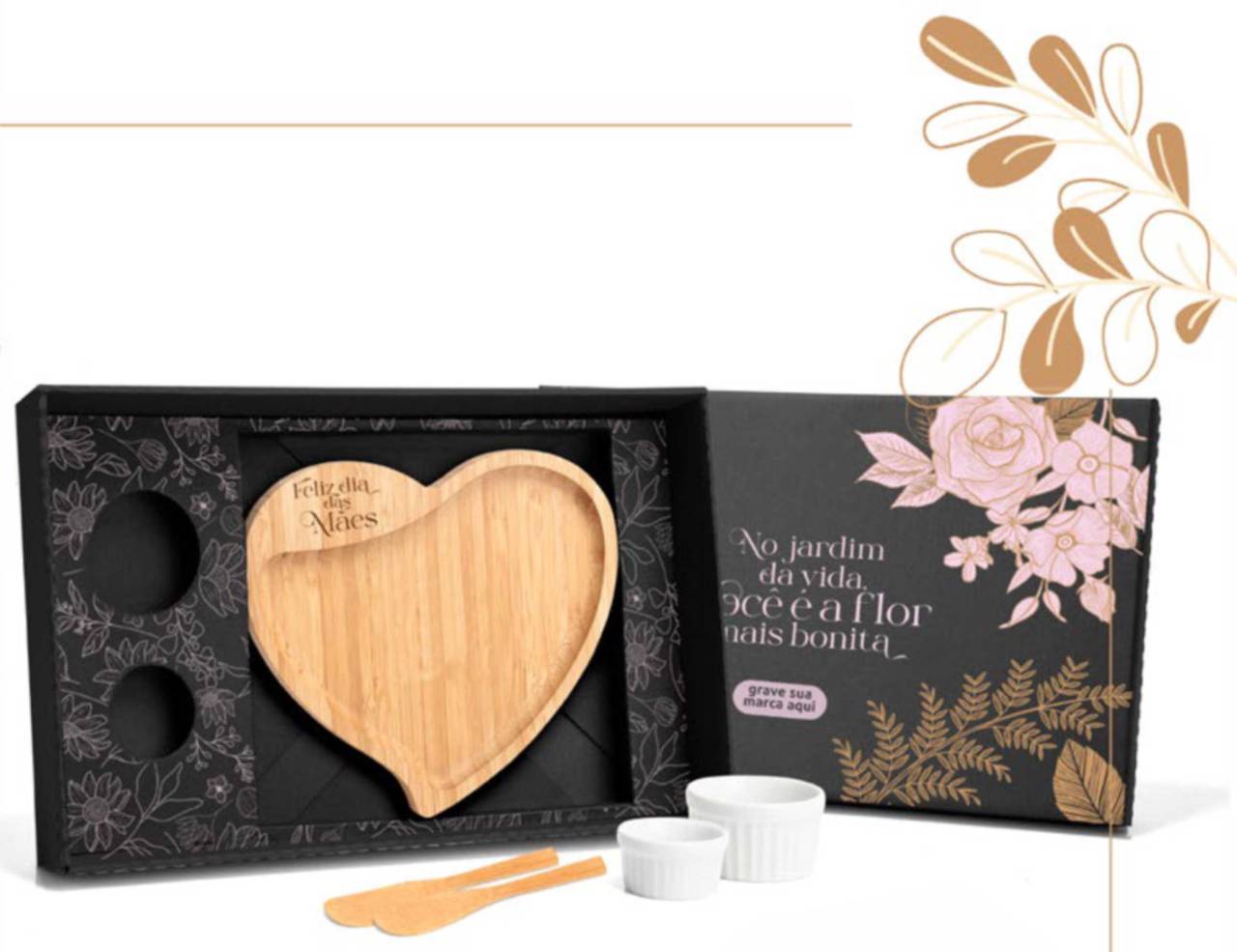 Conta com petisqueira em formato de coração e duas espátulas 14cm em Bambu; dois ramekins, um pequeno e um mini em porcelana.