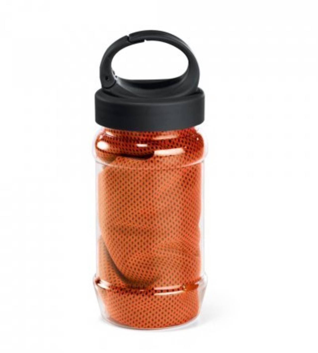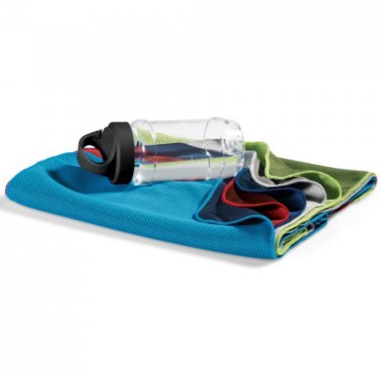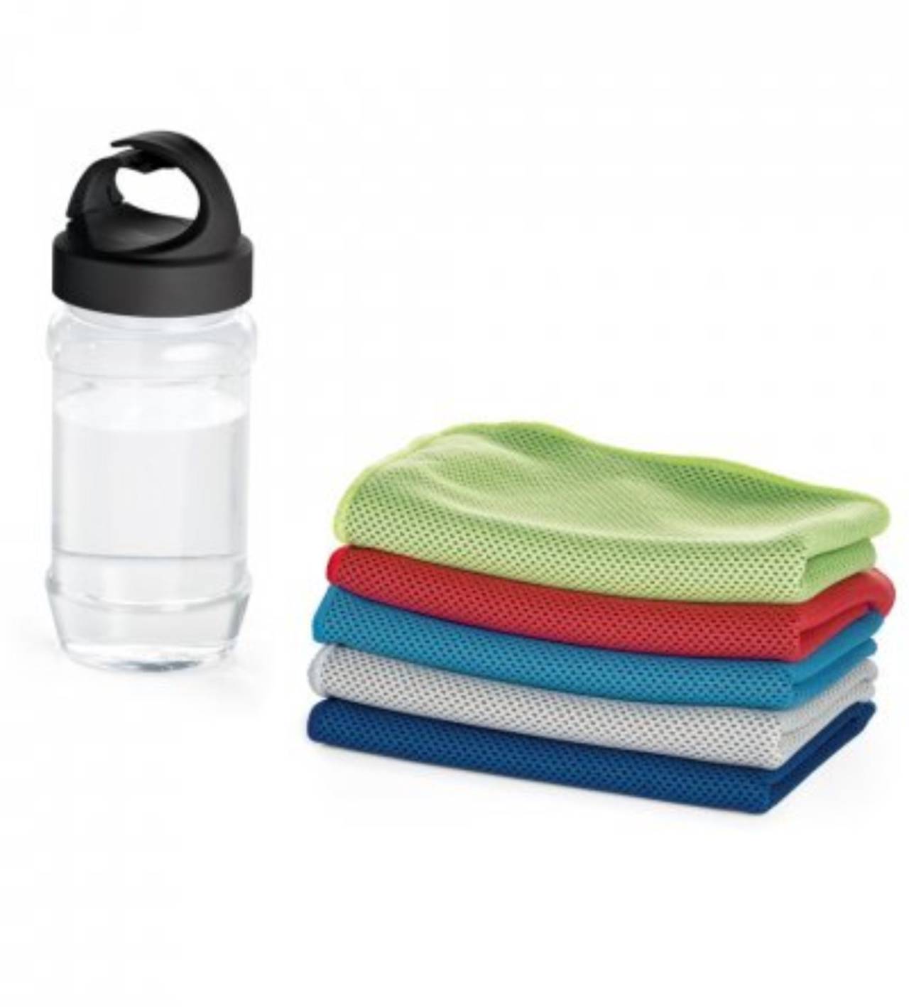Kit toalha e garrafa. Toalha para esporte em poliamida e poliéster. Toalha refrescante, quando molhada permanece fria durante horas. Se aquecer, basta balançar reativando sua frescura. Reutilizável e lavável à máquina. Garrafa em PP e PET com mosquetão incluso (food grade). Capacidade até 440 ml. Caixa branca 94653 vendida opcionalmente. Toalha: 300 x 800 mm | Garrafa: ø65 x 183 mm