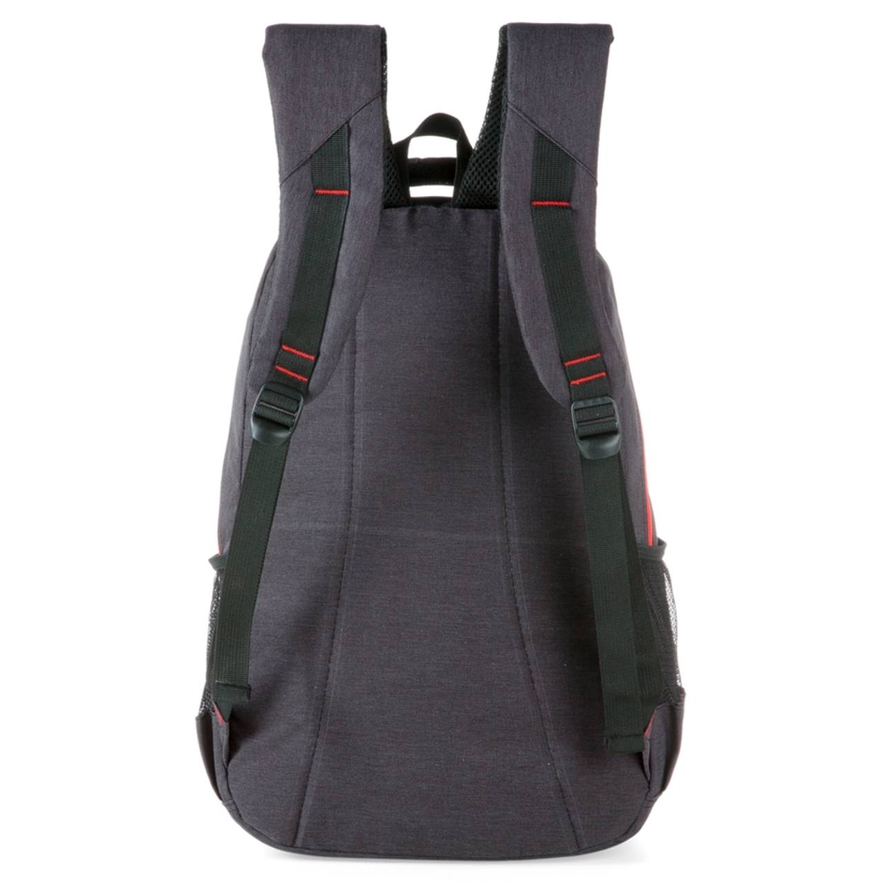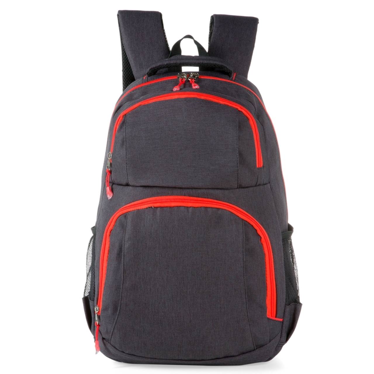 Descrição: Mochila de nylon com compartimento para notebook e detalhes neoprene. Possui compartimento grande com bolso interno; compartimento frontal superior, compartimento inferior com divisórias para canetas e documentos, dois bolsos laterais de tela(nylon). Zíperes com puxador plástico, alça de nylon e alças ajustáveis para as costas revestidas com espuma.