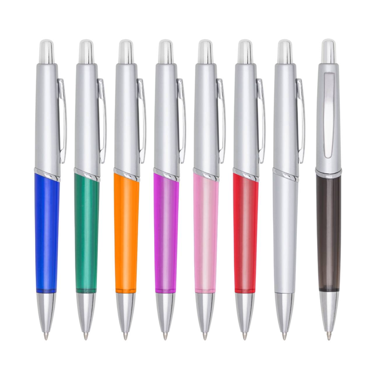 Descrição: Caneta plástica com carga esferográfica azul e acionamento por clique.