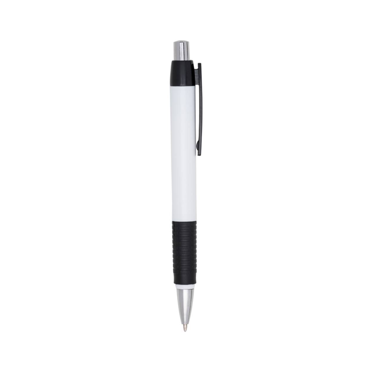 Descrição: Caneta plástica com detalhe emborrachado, carga esferográfica azul e acionamento por clique.