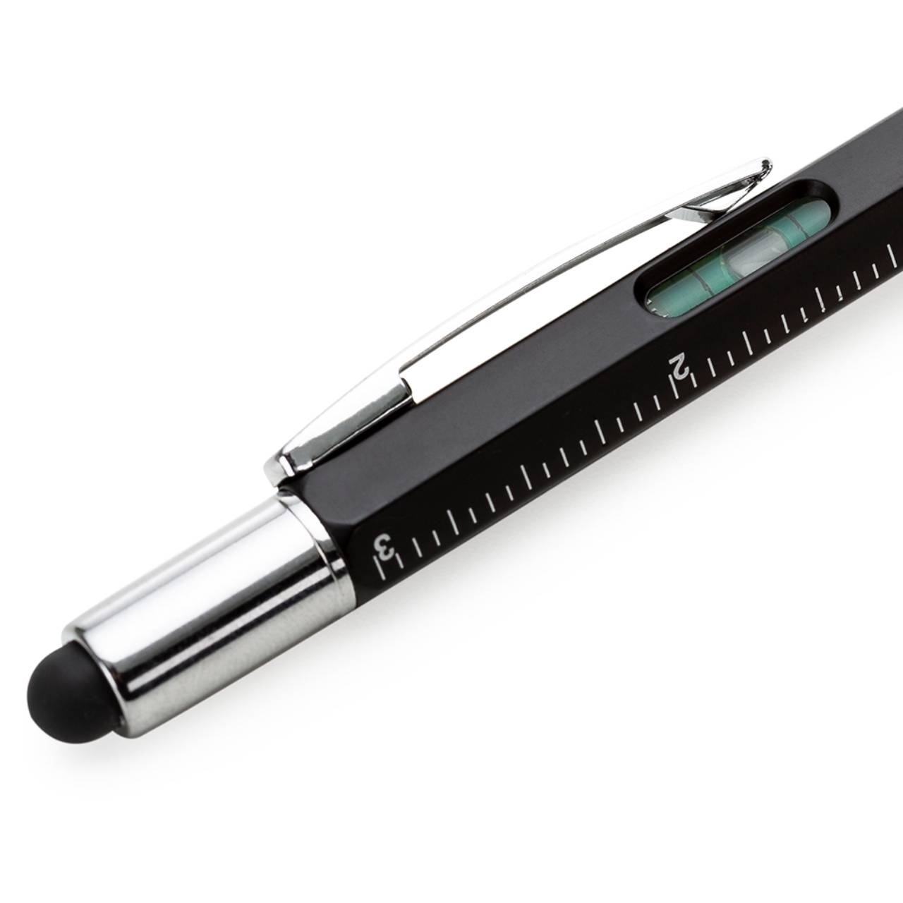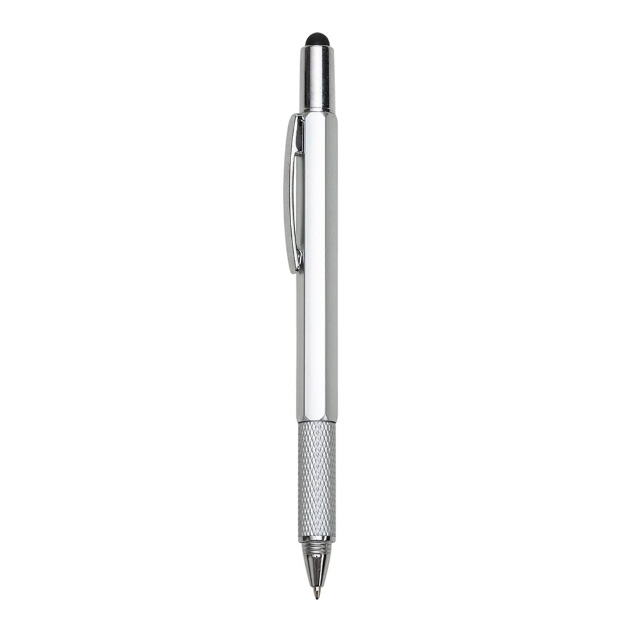 Descrição: Caneta plástica multifunções, contém réguas com medição em centímetros (alcance 7cm) e polegadas (alcance 3pol), medidor de nível e compartimento superior touch screen com duas mini chaves: Philips e Fenda. Carga esferográfica azul e acionamento por rotação.