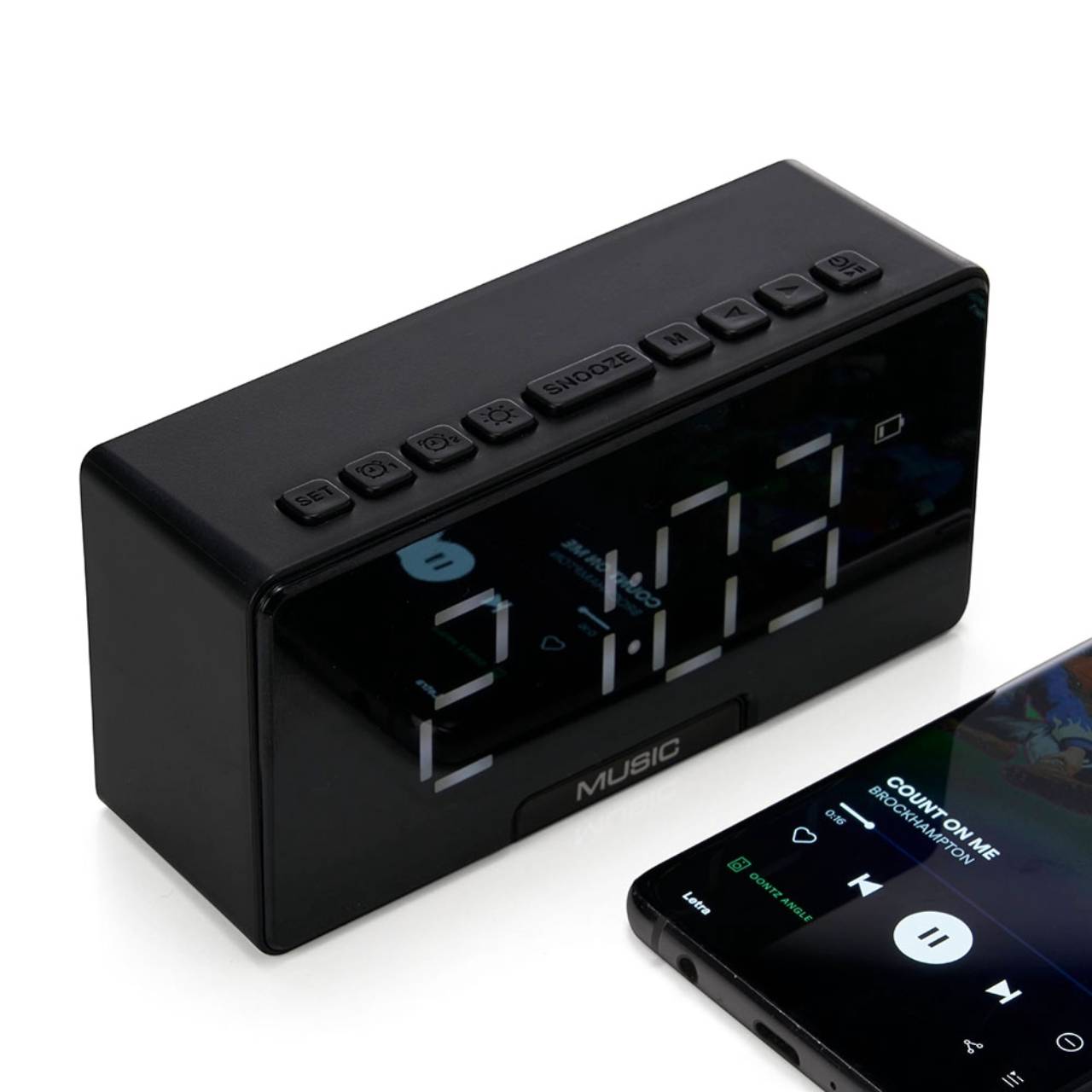 Descrição: Caixa de som multimídia com relógio despertador e suporte para celular. Produzida em plástico e com borrachas antiderrapantes na área inferior, a caixa de som tem a área frontal com display de LED, além de um compartimento com suporte para celular – uma espécie de “gaveta” aonde é exibido (MUSIC), basta puxá-la ter acesso ao compartimento. A caixa de som executa nos modos bluetooth, cartão TF-microSD e entrada auxiliar P2. Acompanha cabo USB e manual em inglês.