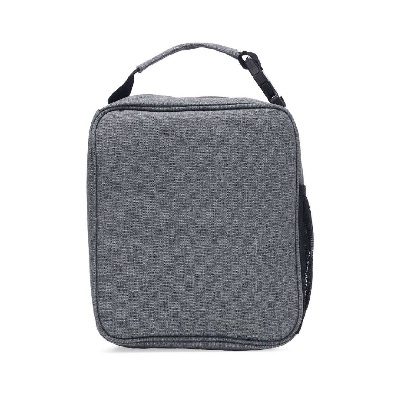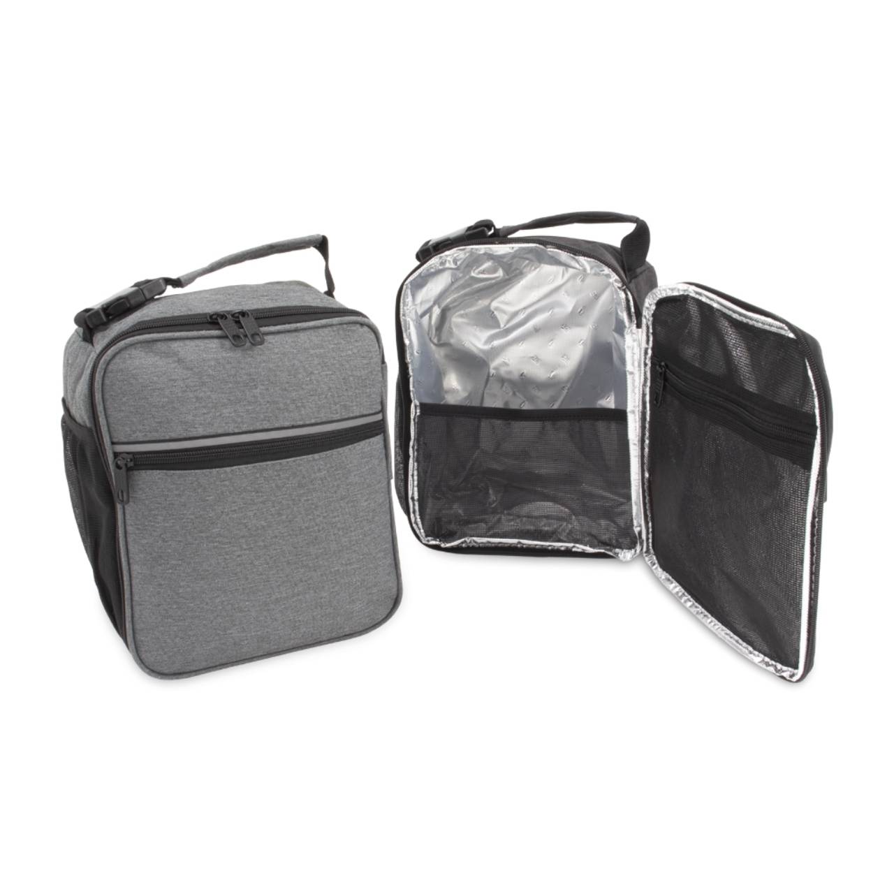 Descrição: Bolsa térmica de nylon com dois compartimentos, capacidade de 6 litros. Com bolso telado e tela média de proteção interna, a bolsa possui uma faixa frontal refletiva, bolso lateral telado e alça de mão com fivela de encaixe.