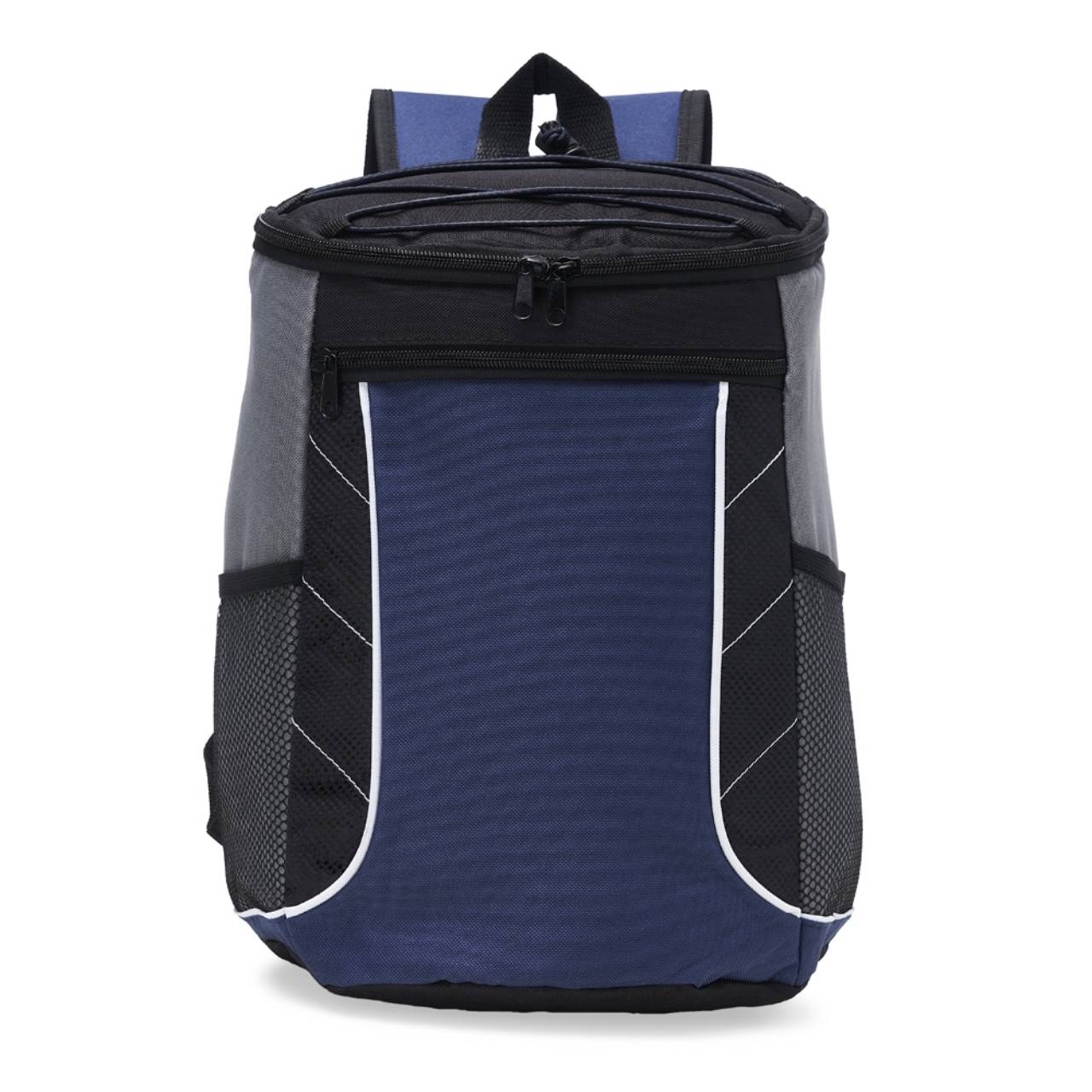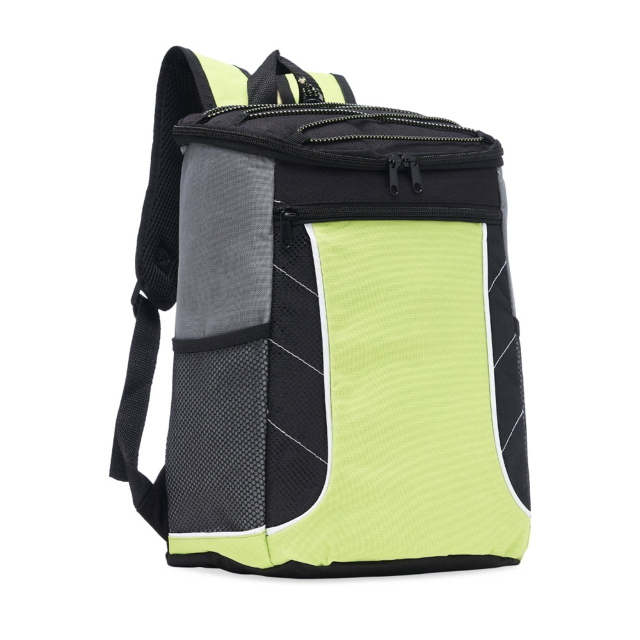 Descrição: Bolsa térmica de poliéster com dois compartimentos, capacidade de 18 litros. A bolsa possui revestimento térmico em PEVA atóxico, bolsos laterais telados, alça de mão e alça para as costas com revestimento espumado.