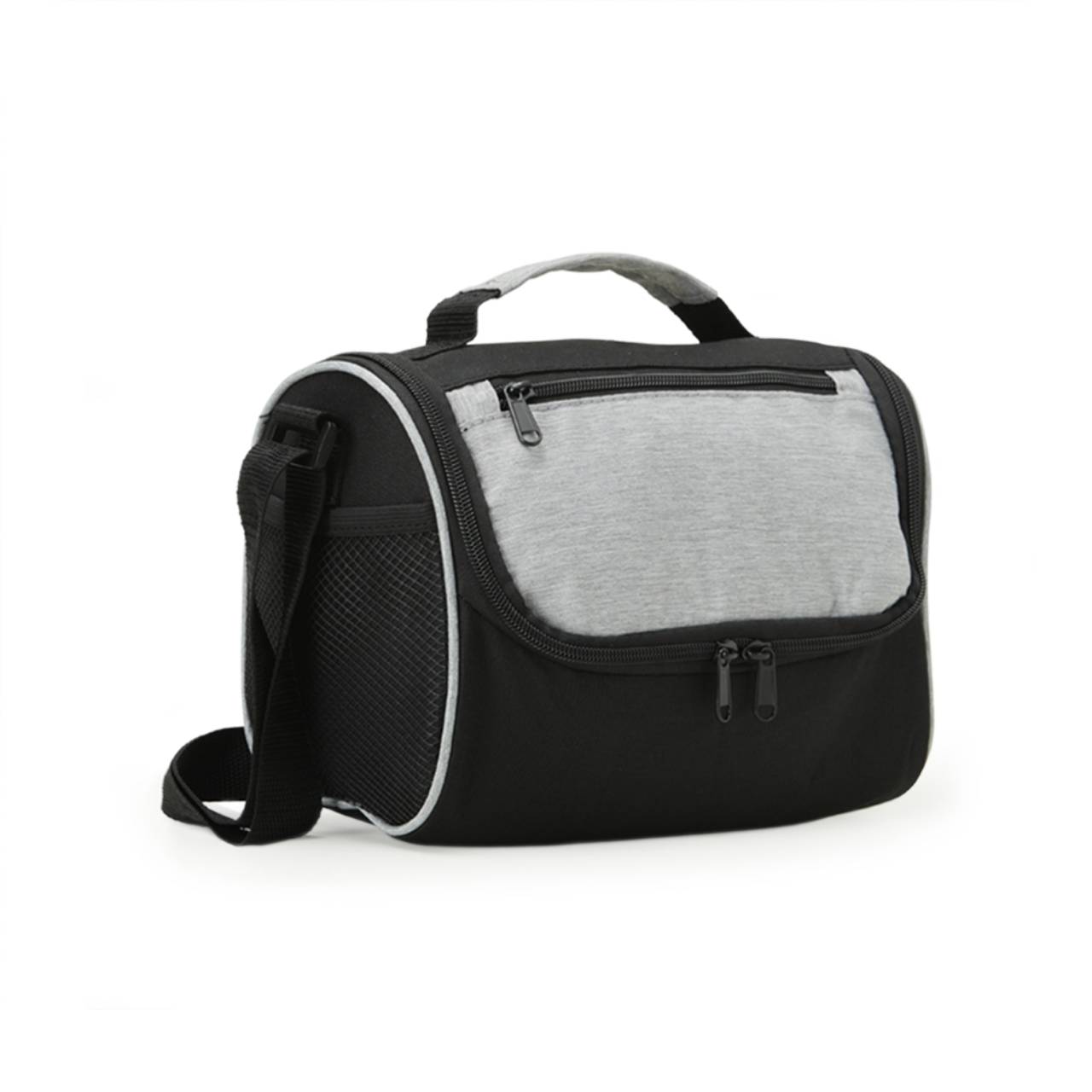Descrição: Bolsa térmica de poliéster com dois compartimentos, capacidade de 7 litros. A bolsa possui revestimento térmico em PEVA atóxico, alça de mão, bolsos laterais telados e alça transversal.