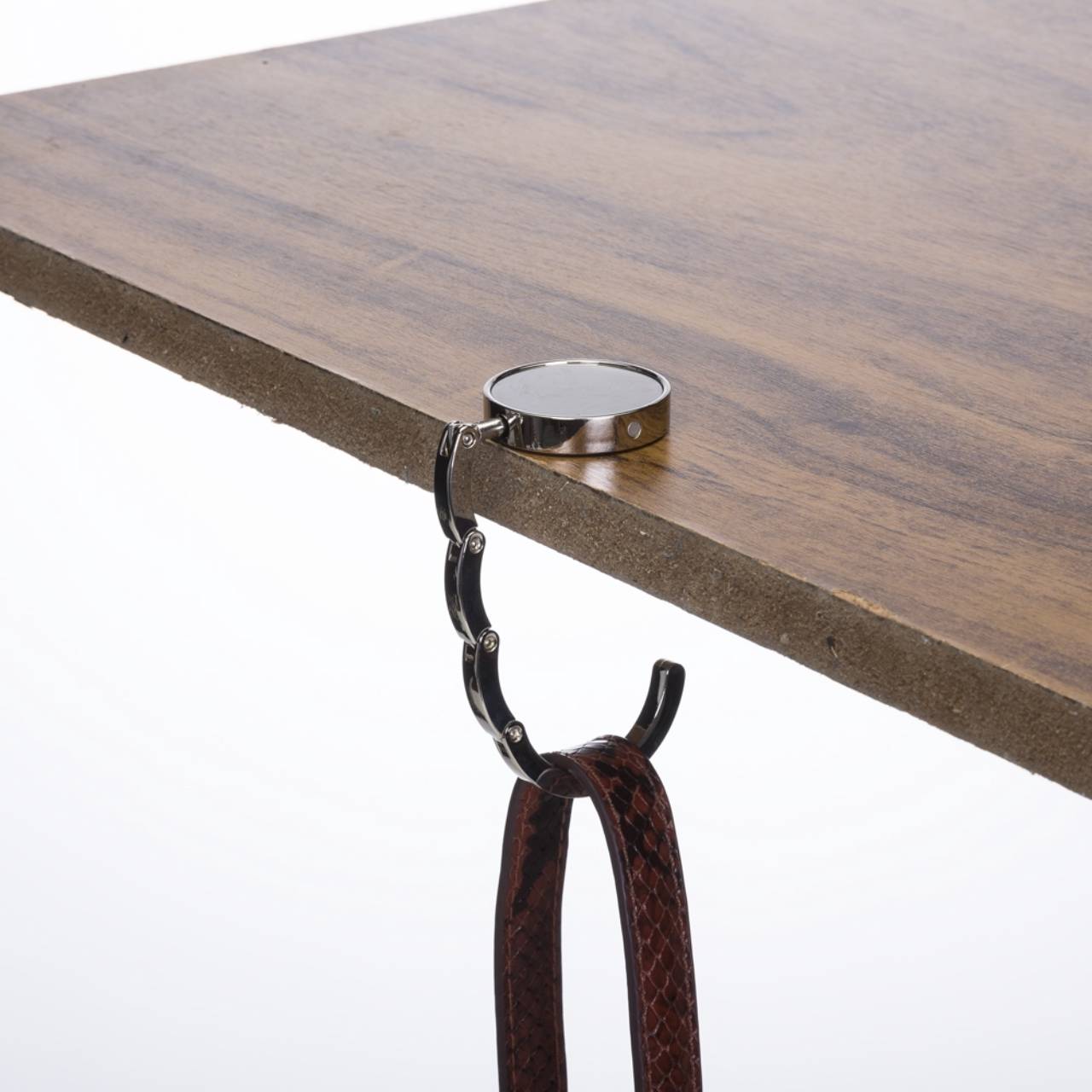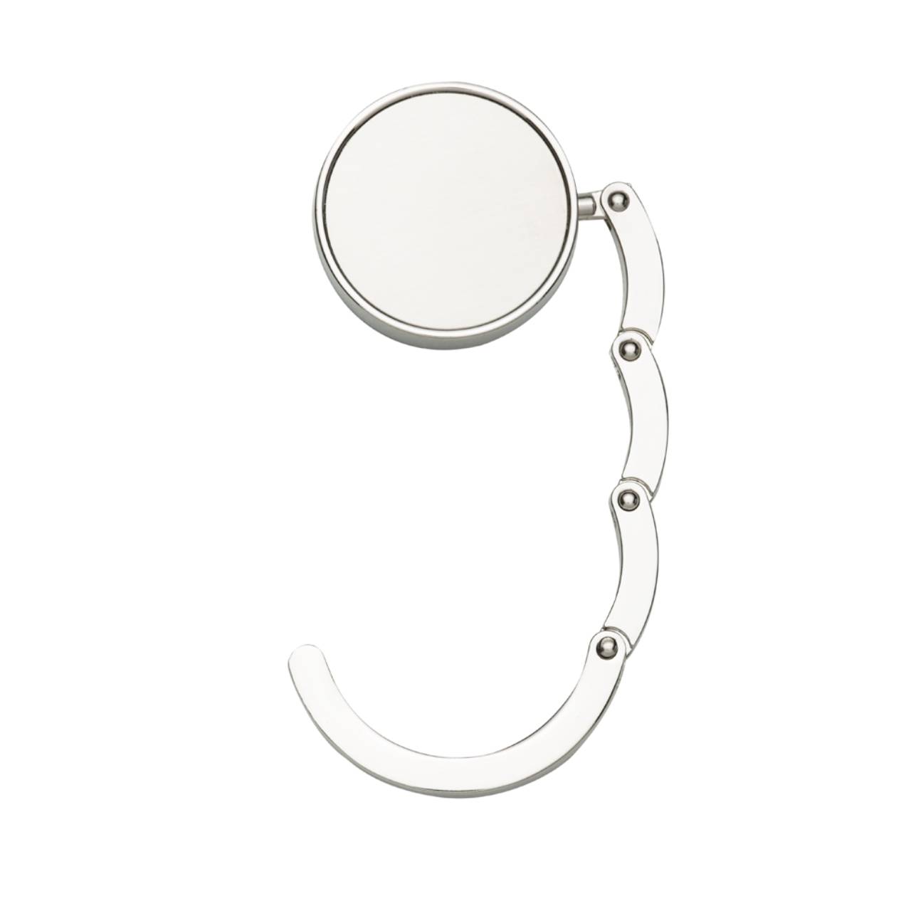 Descrição: Porta bolsa de metal dobrável, possui chapa central redonda para gravação e parte traseira borracha anti deslizante. Para utilizar o porta bolsa basta puxar a lateral(é imantado) e abri-lo.