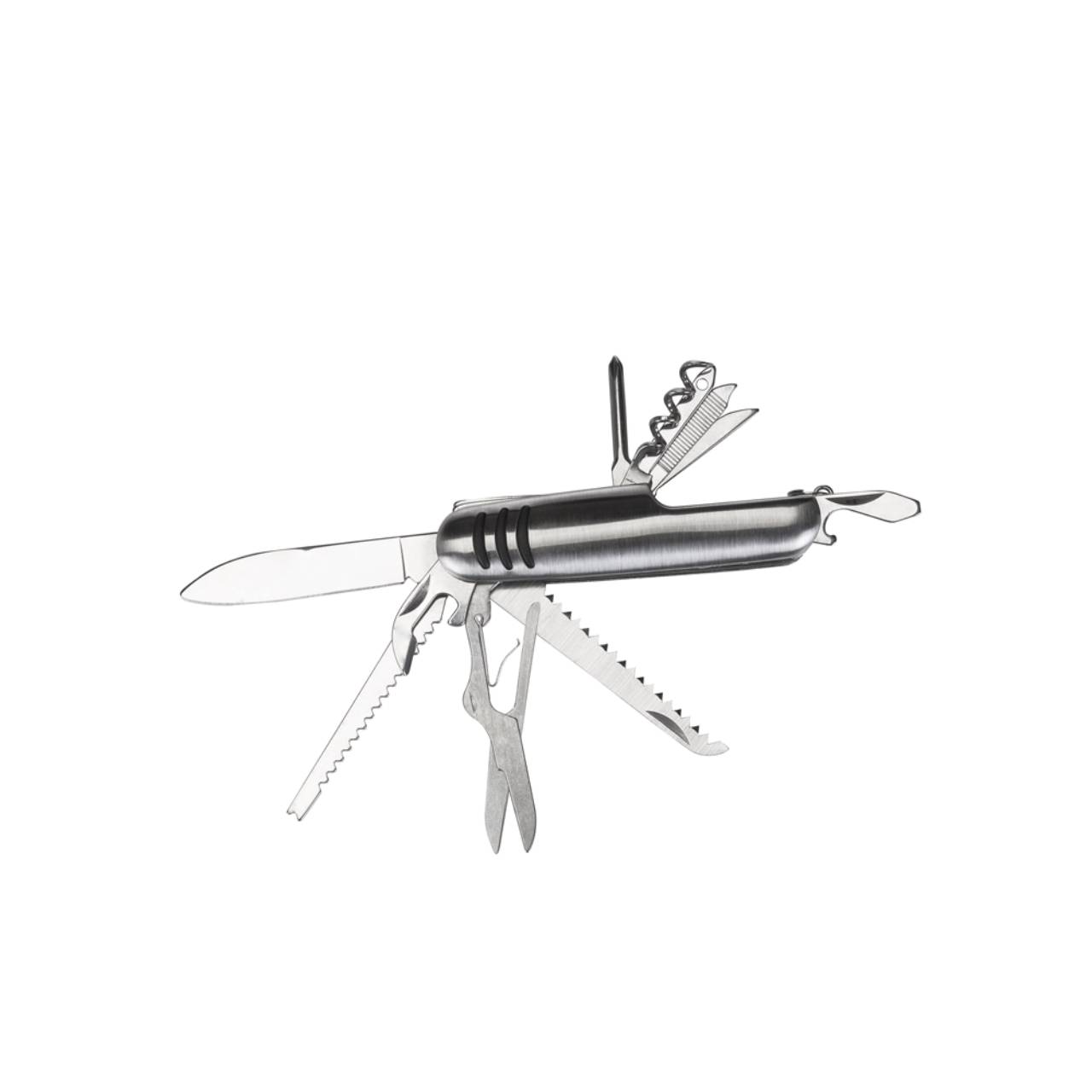 Descrição: Canivete metal 11 funções com detalhes emborrachados preto(três linhas frente e verso). Possui: lâmina de corte, serrilha, serra madeira, mini tesoura, abridor de latas, abridor de garrafa, chave phillips, lamina de remoção e limpeza, lixa, agulha de sutura e saca-rolhas. Acompanha bainha em nylon.