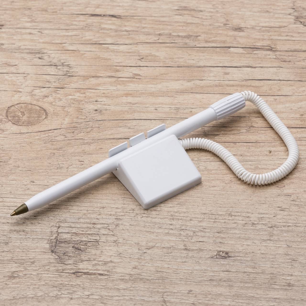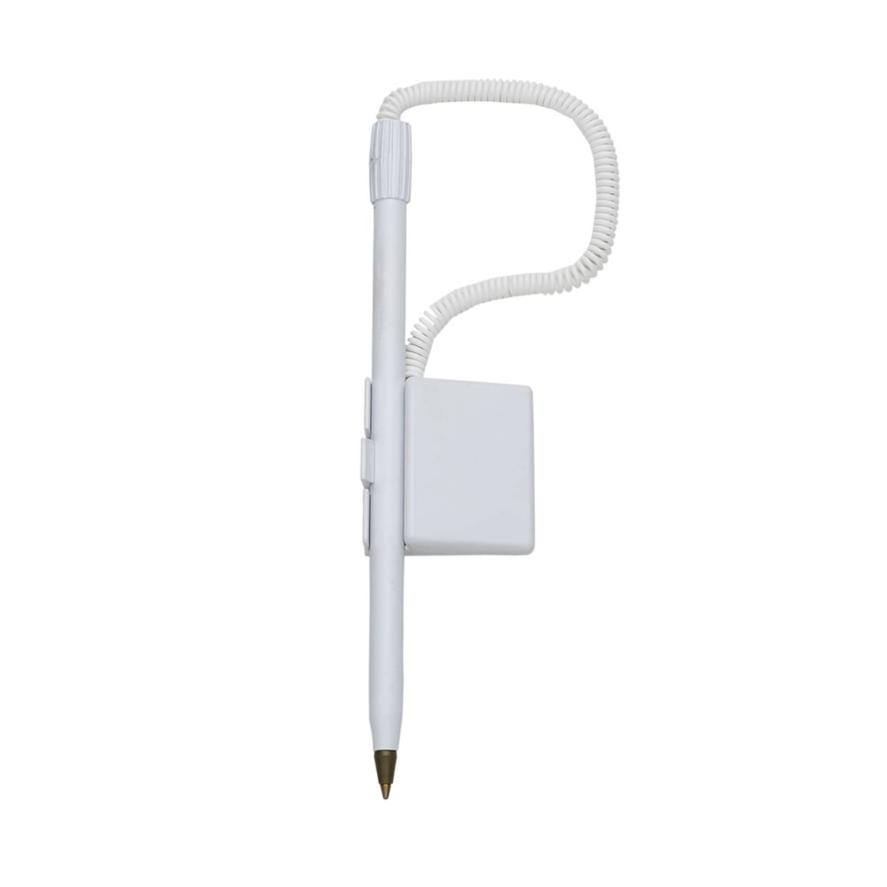 Descrição: Caneta balcão plástica com suporte e adesivo auto colante. Carga esferográfica azul. QUANTIDADE MÍNIMA DE 100 PEÇAS!
