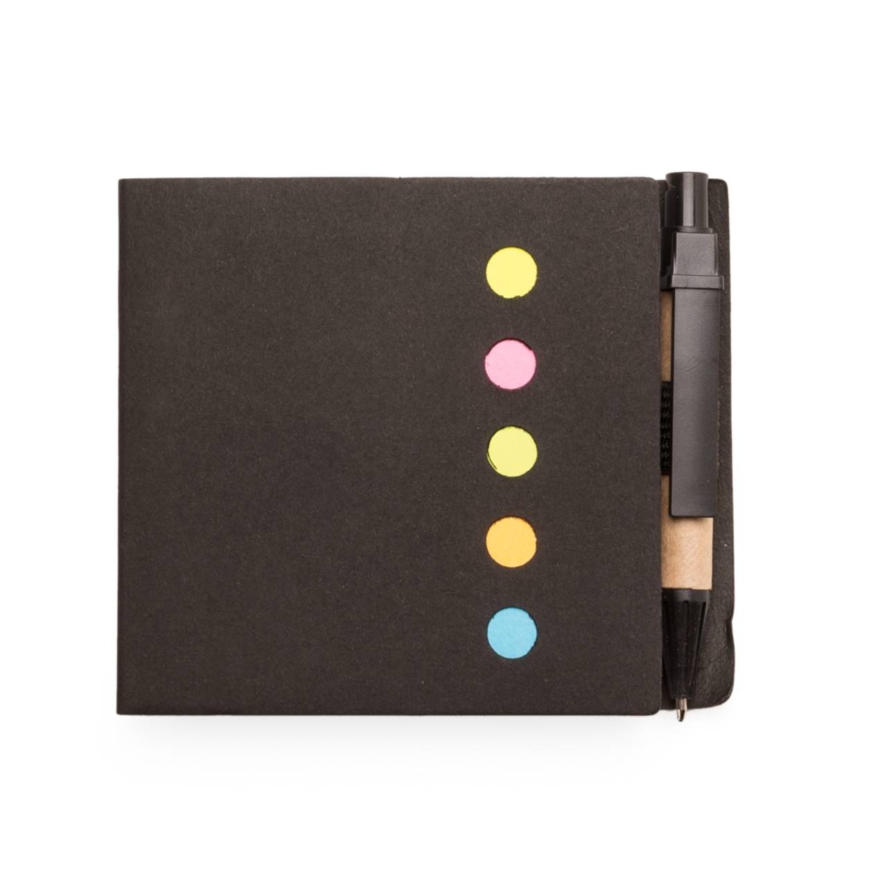 Descrição: Bloco ecológico(kraft) com autoadesivos e mini caneta. Possui cinco detalhes circulares vazados na parte inferior, caneta ecológica de papelão com clip e ponteira plástica. Bloco branco sem pauta com aproximadamente 100 folhas e cinco blocos autoadesivos coloridos com aproximadamente 20 folhas cada.