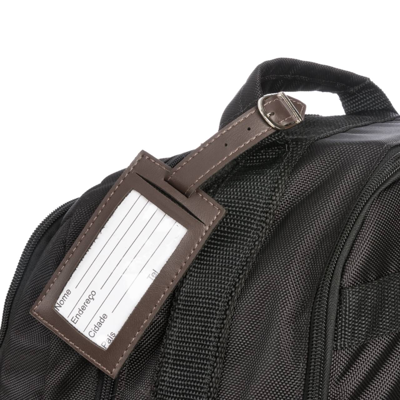 Descrição: Tag identificador de bagagem de couro sintético. Parte frontal com bolso de visor plástico e lado inverso liso, possui fivela prata com 3 tamanhos de encaixe.