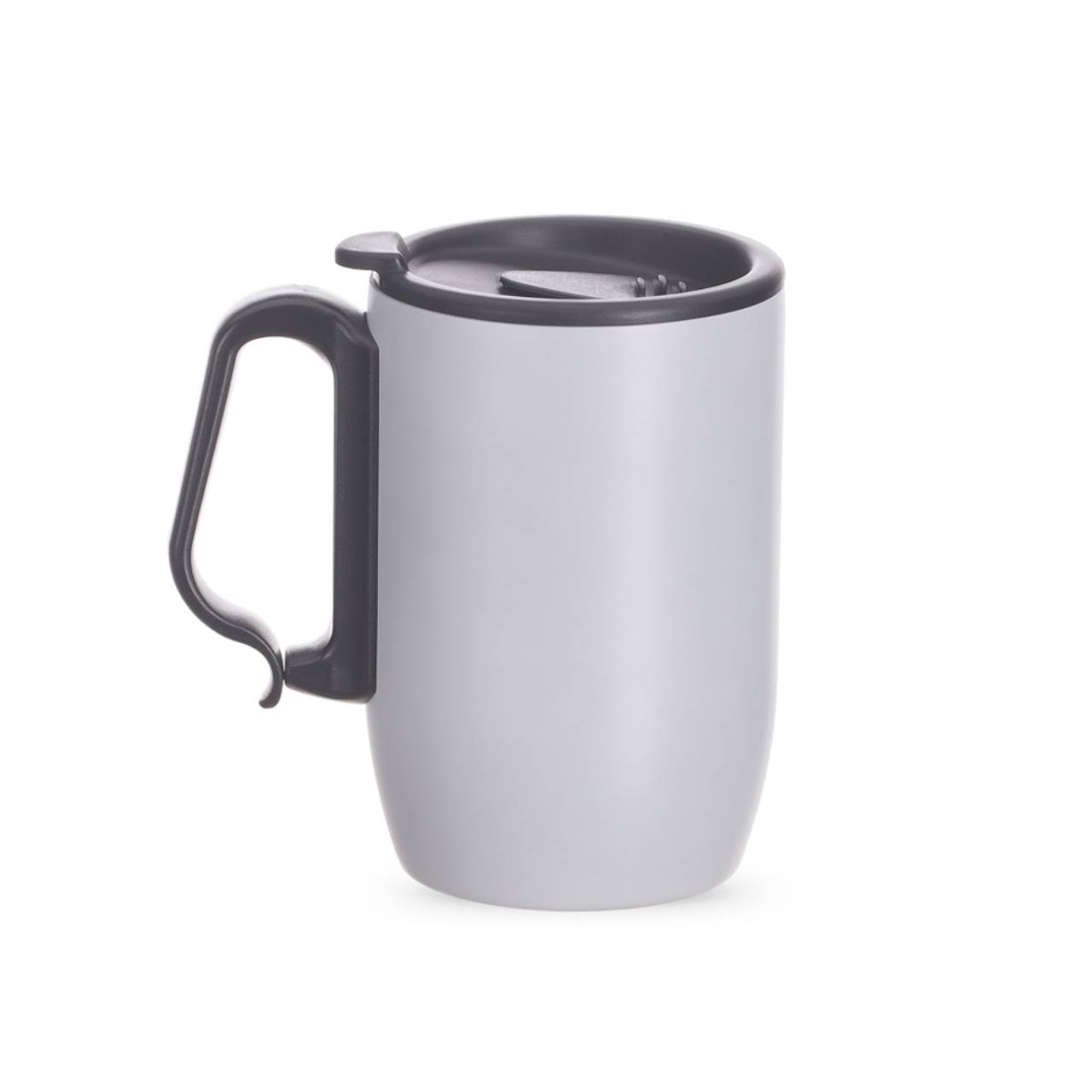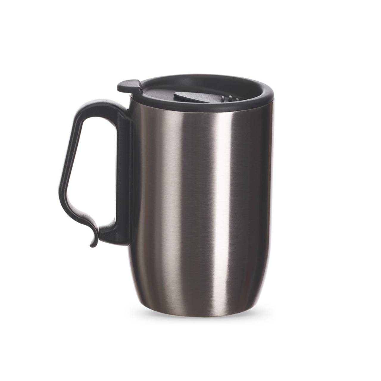 Descrição: Caneca inox 350ml com parede dupla. Possui tampa plástica com trava para abertura do bocal, alça plástica estilo mosquetão e base com apoio EVA. Obs.: Conserva temperatura.