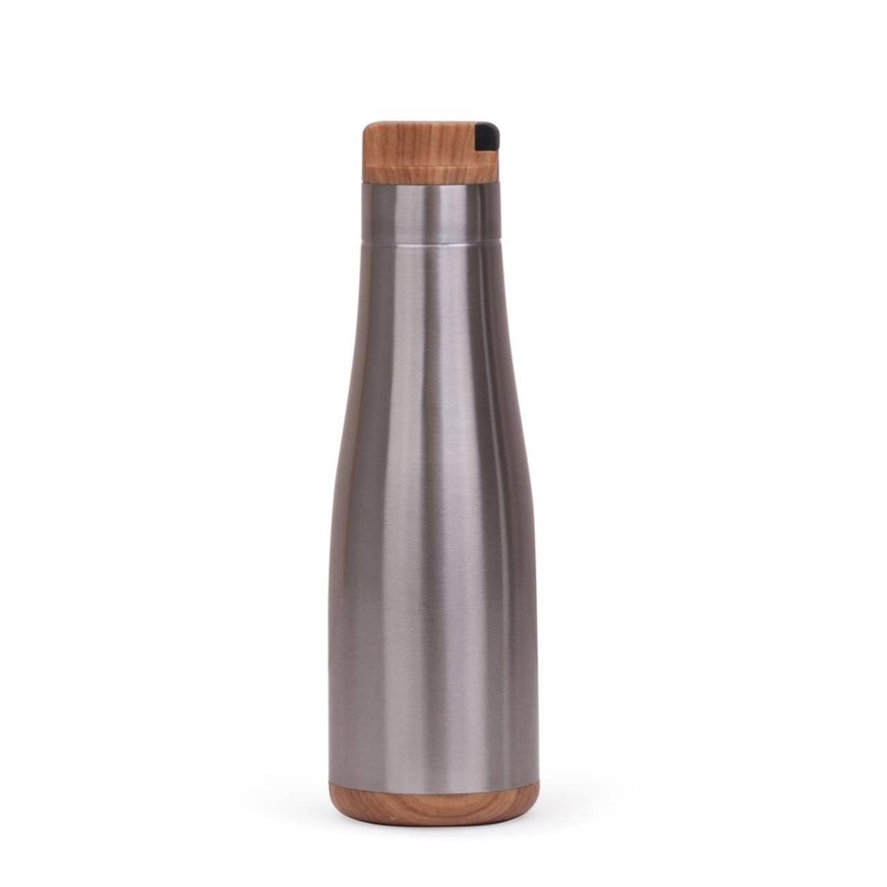 Descrição: Garrafa de Inox 730ml com detalhes plásticos imitando de madeira, possui tampa rosqueável com alça retrátil emborrachada.