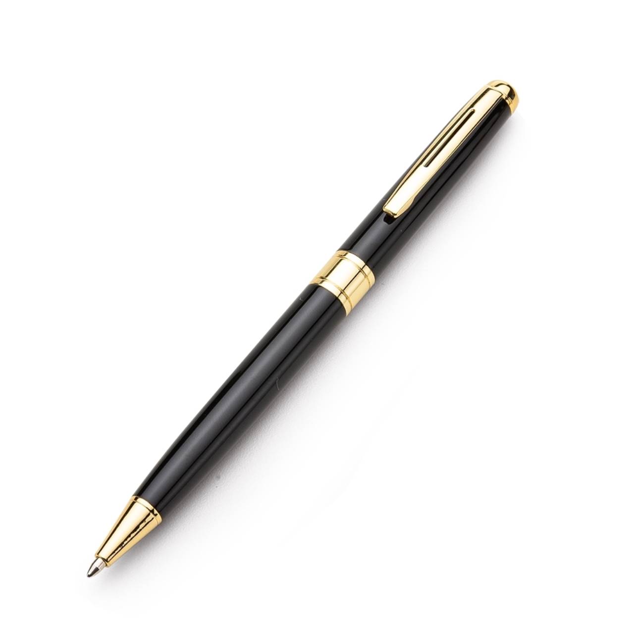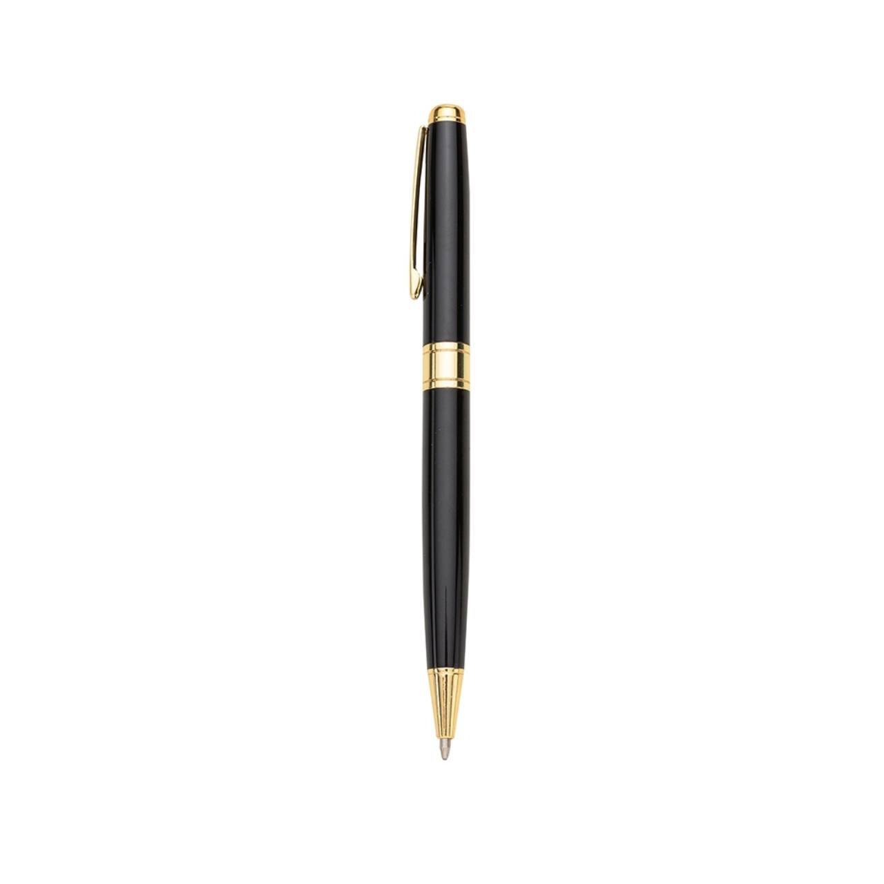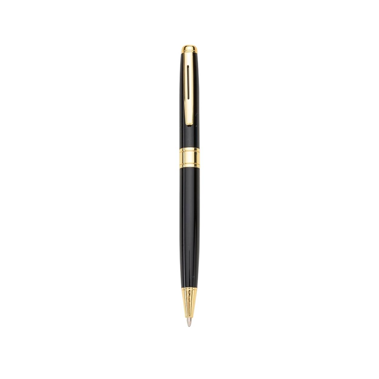 Descrição: Caneta metálica com carga esferográfica azul e acionamento por rotação.
