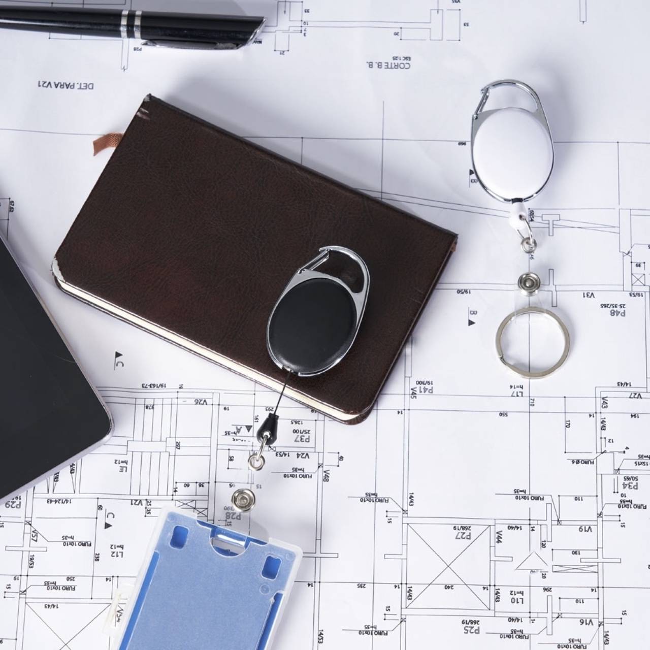 Descrição: Chaveiro estilo mosquetão retrátil com porta crachá. Feito de metal e PVC. Acompanha argola em inox para chaveiro e suporte transparente para crachá com botão de pressão. Possui um clip atrás para pendurar.