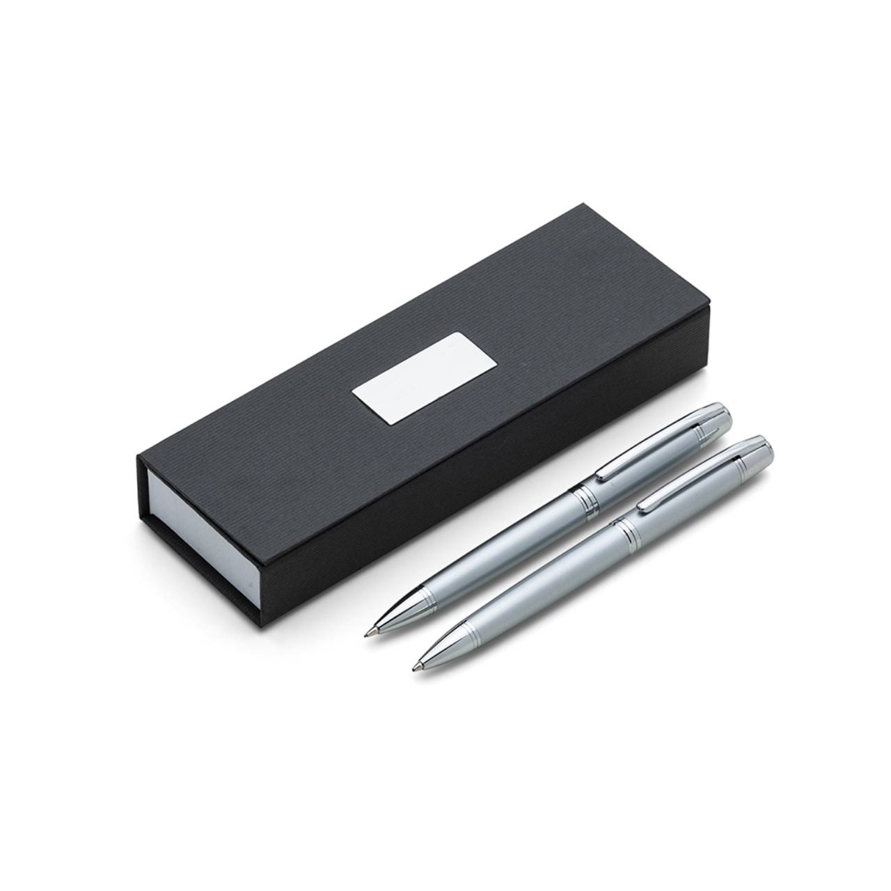 Descrição: Conjunto caneta e lapiseira em estojo de cartonagem com placa central para personalização. Clip metal com dois anéis em relevo, anel centralizado e dois anéis em relevo na ponteira e acionam por giro. Estojo revestida com espuma na parte interna.