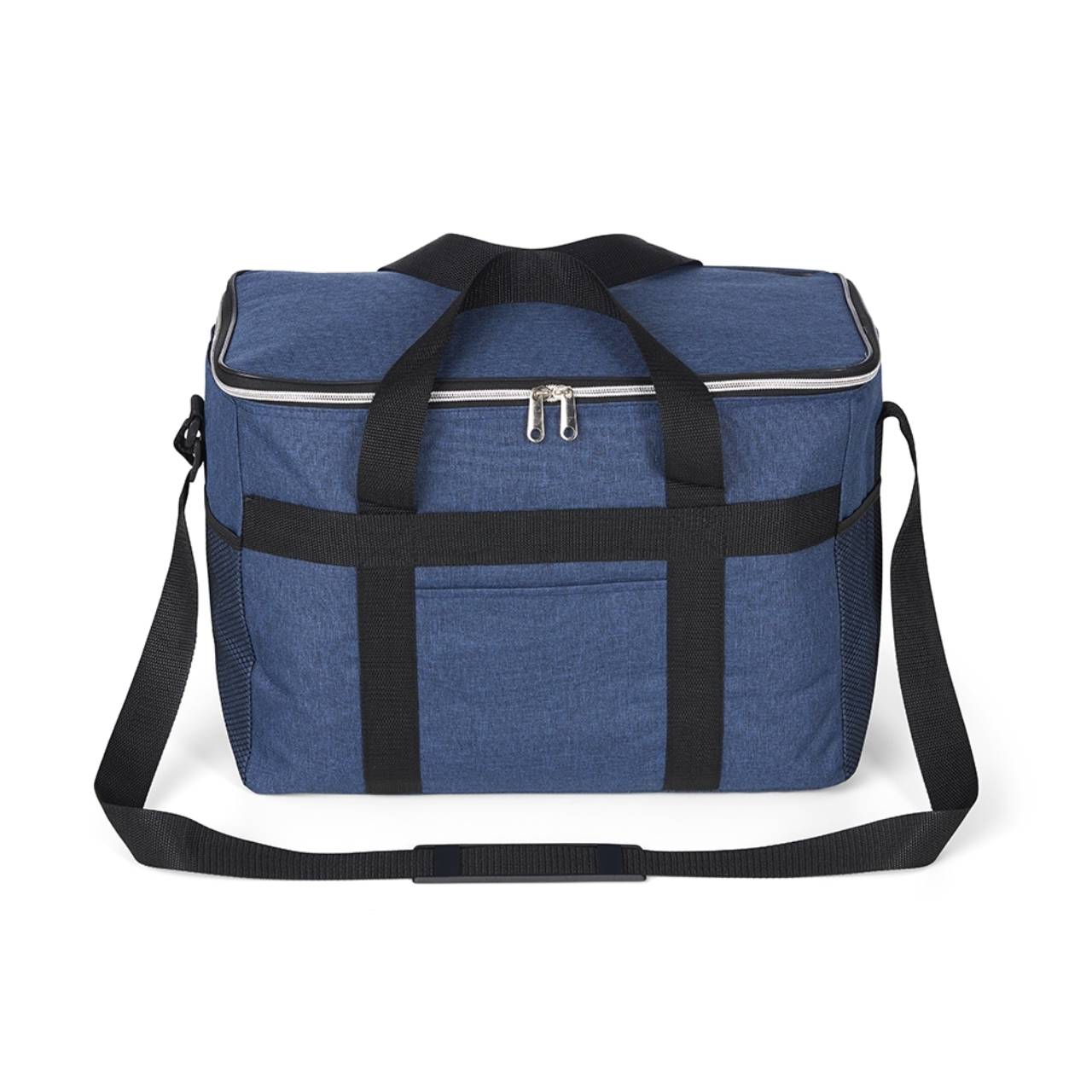 Descrição: Bolsa térmica de poliéster oxford 300D de 33 litros com bolso frontal e bolsos laterais em malha.