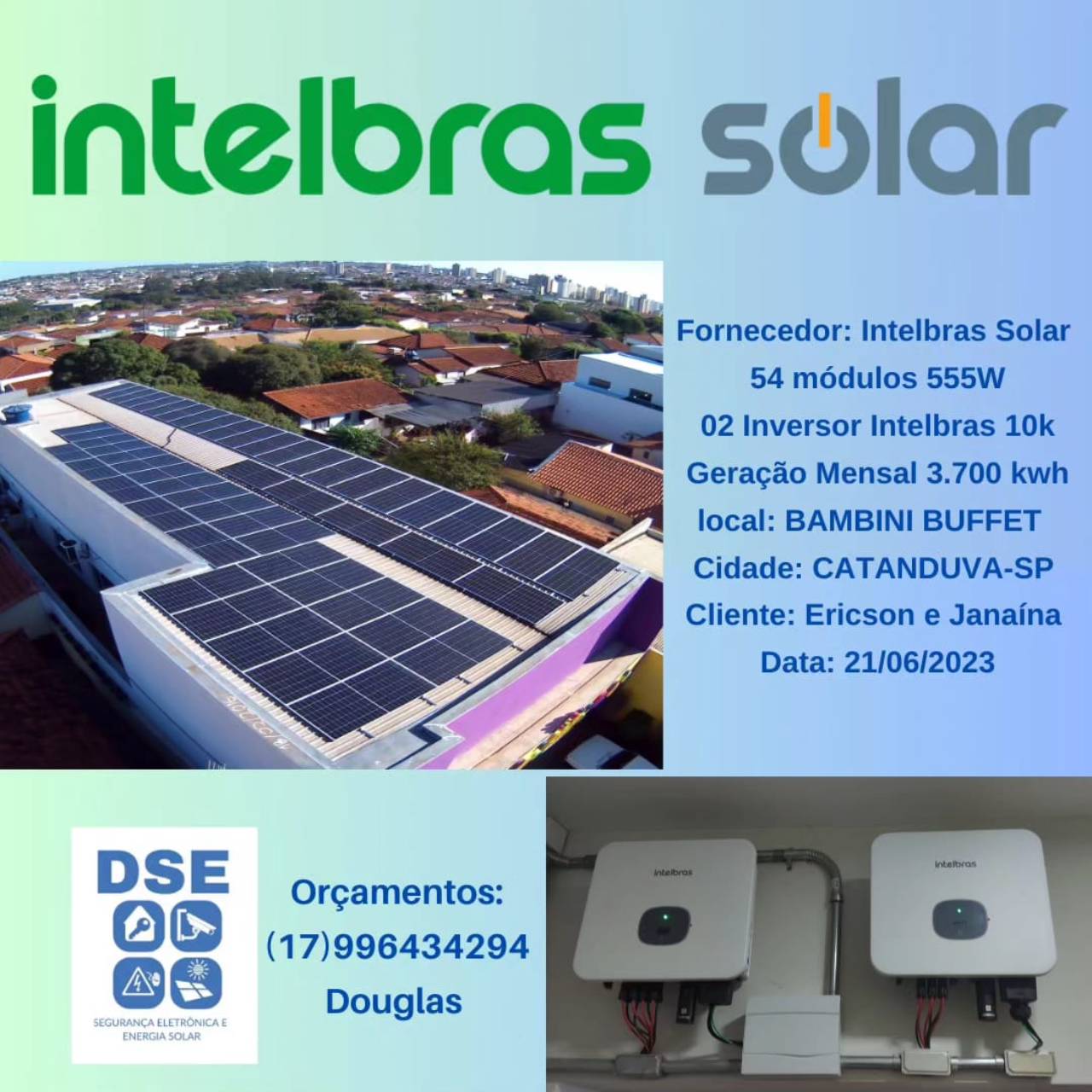 • - Instalação de sistema de energia solar on-grid conectado à rede elétrica local