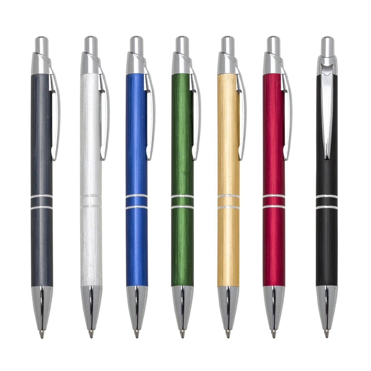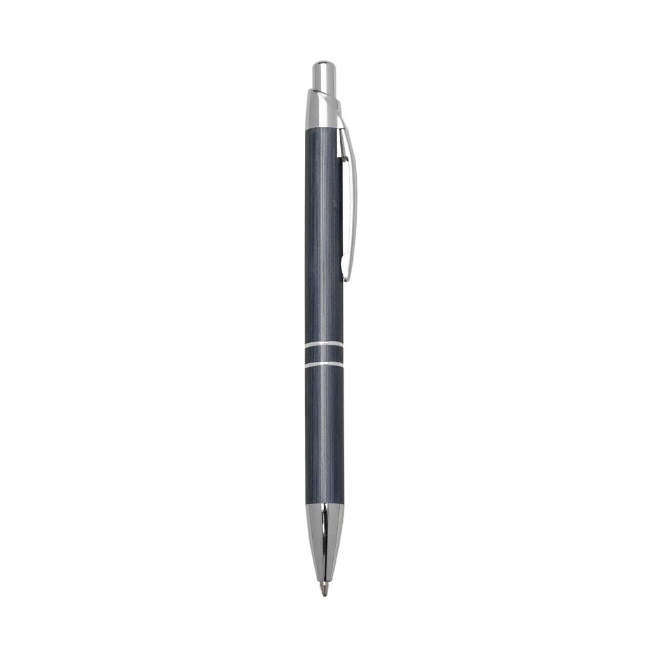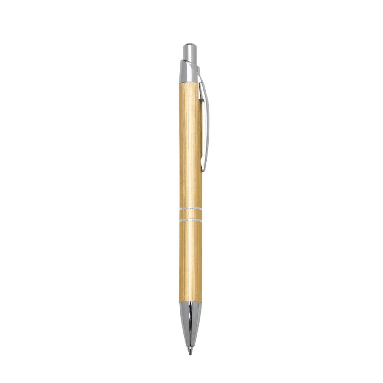 Descrição: Caneta metálica com carga esferográfica azul e acionamento por clique.