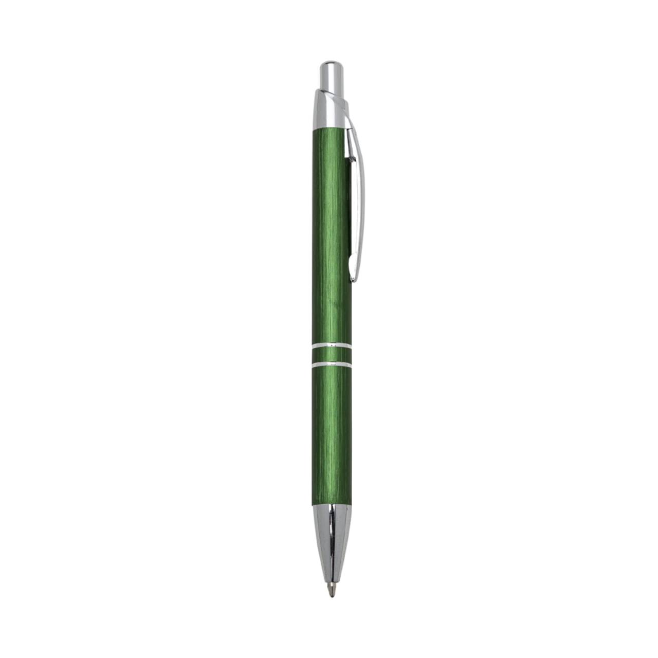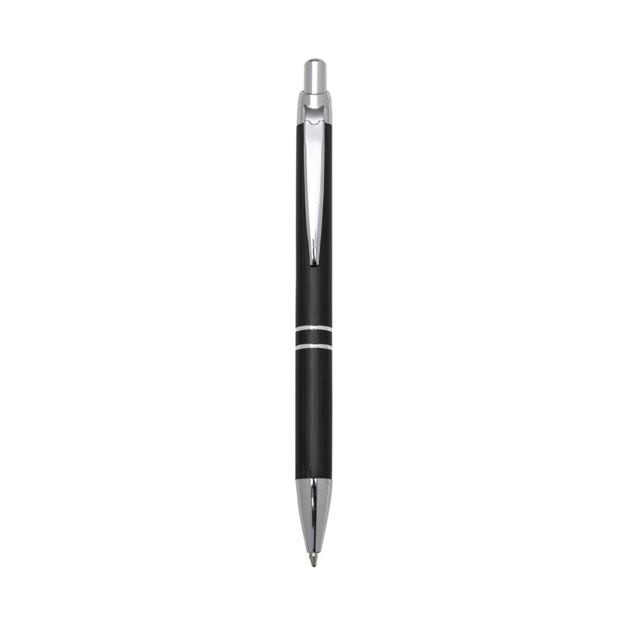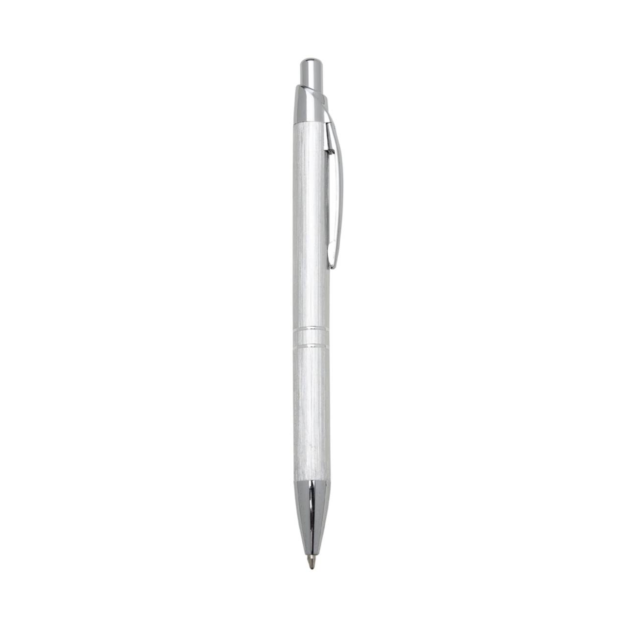 Descrição: Caneta metálica com carga esferográfica azul e acionamento por clique.