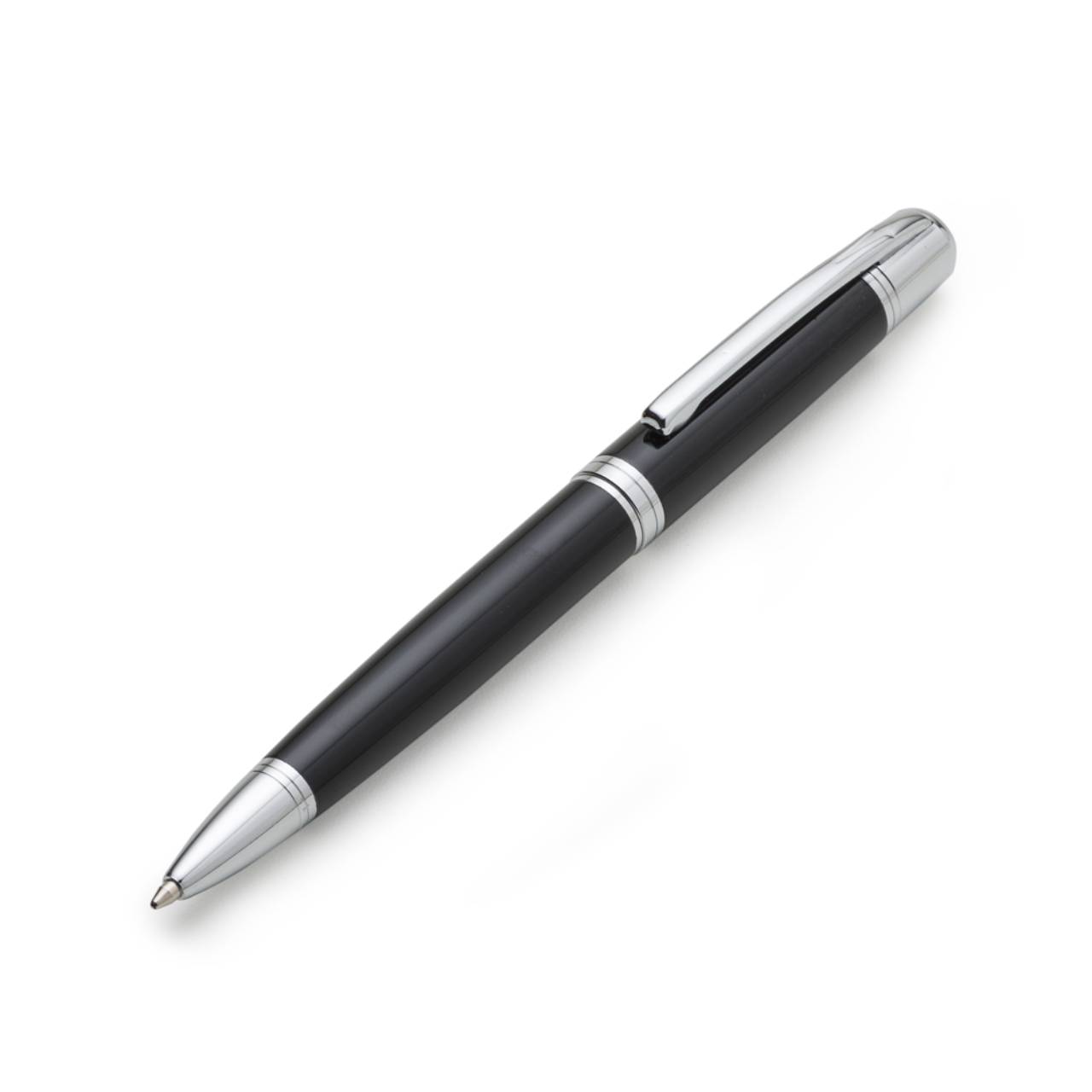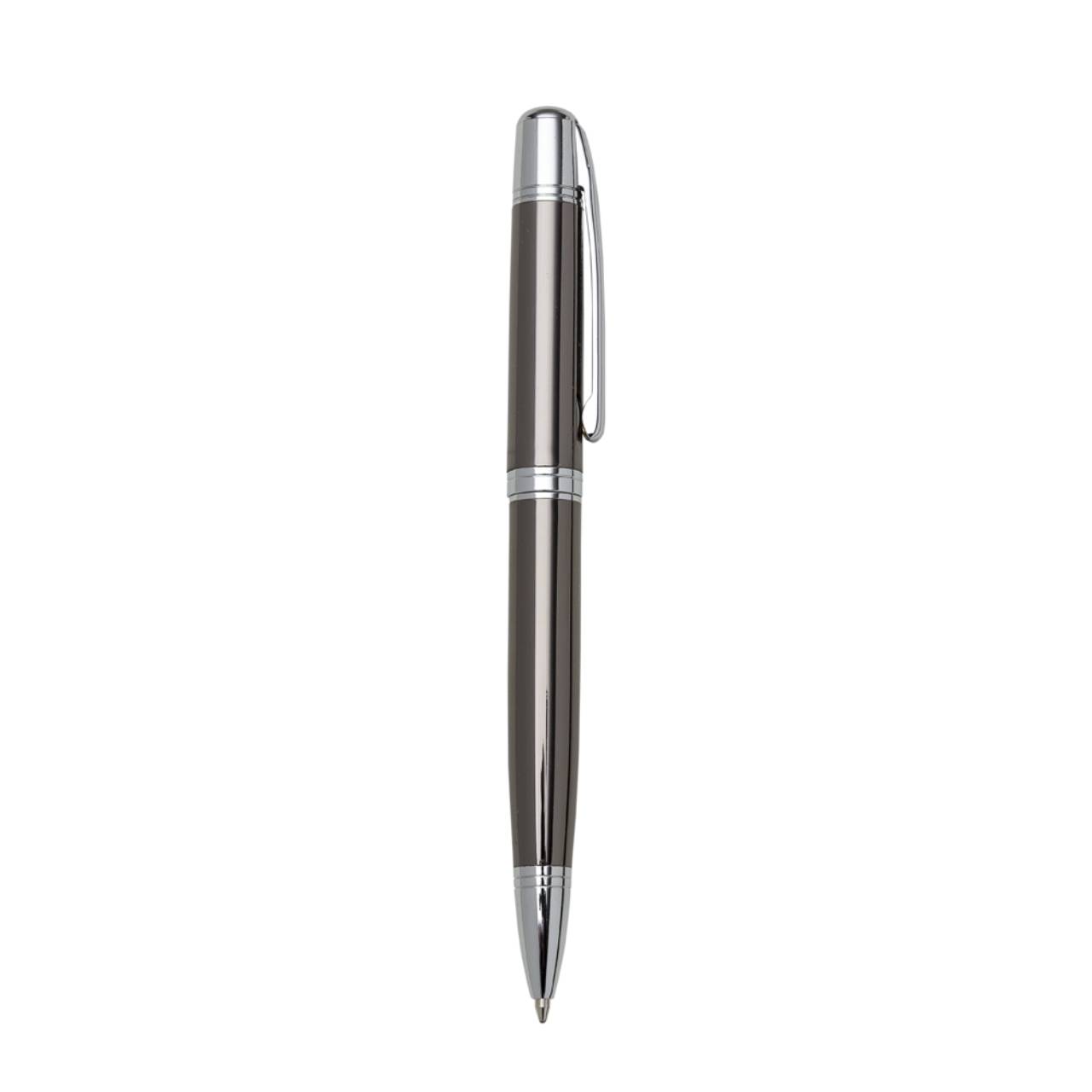 Descrição: Caneta metálica com carga esferográfica azul e acionamento por rotação.