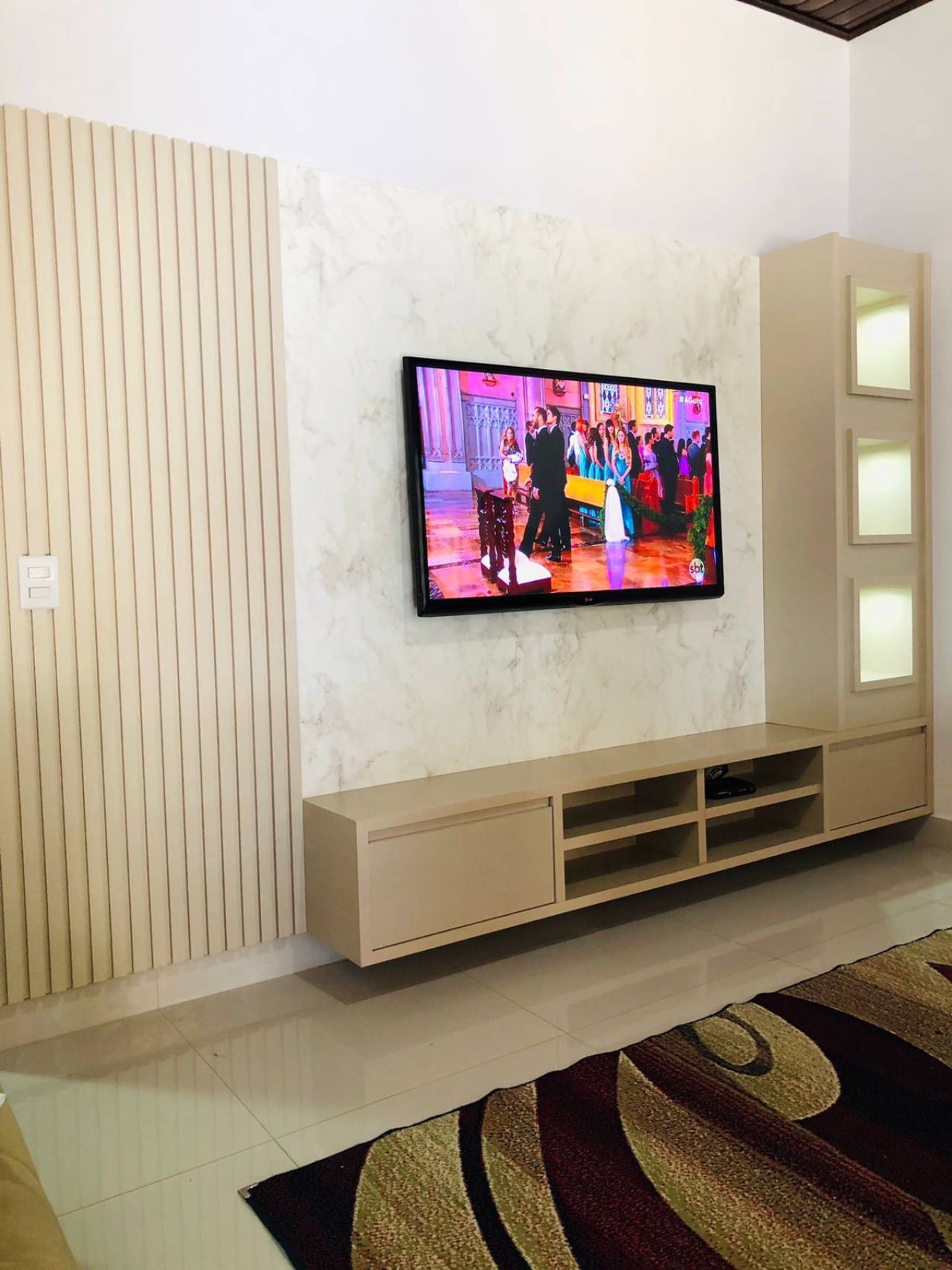 Estrutura: Painéis, racks, estantes e nichos planejados para diferentes tamanhos de TV.