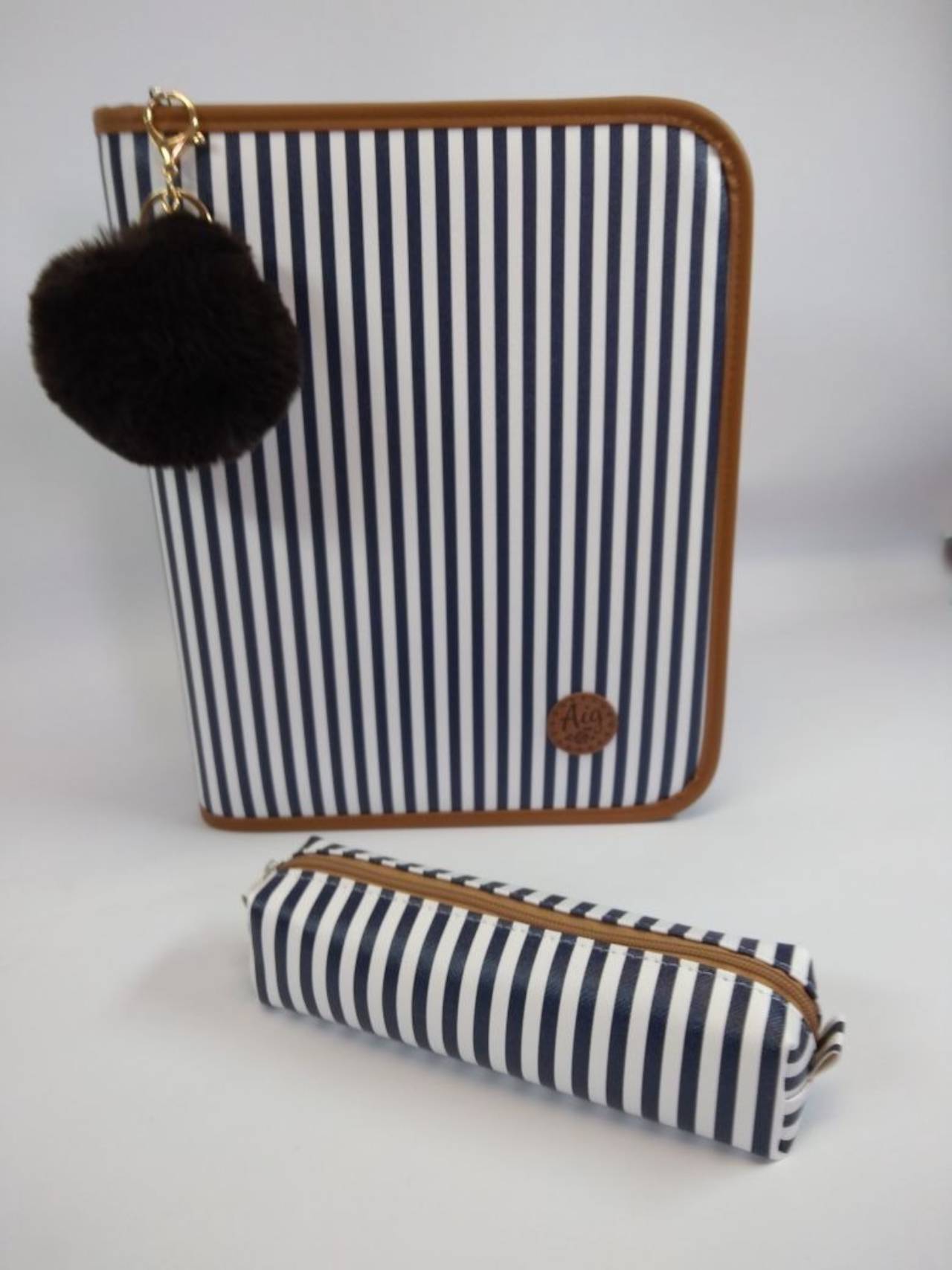 KIT FICHÁRIO CADERNO ARGOLADO PEQUENO 1/4 A5 +ESTOJO +POMPOM LISTRADO AZUL/BEGE -São Bernardo do Campo- JR Mix Variedades