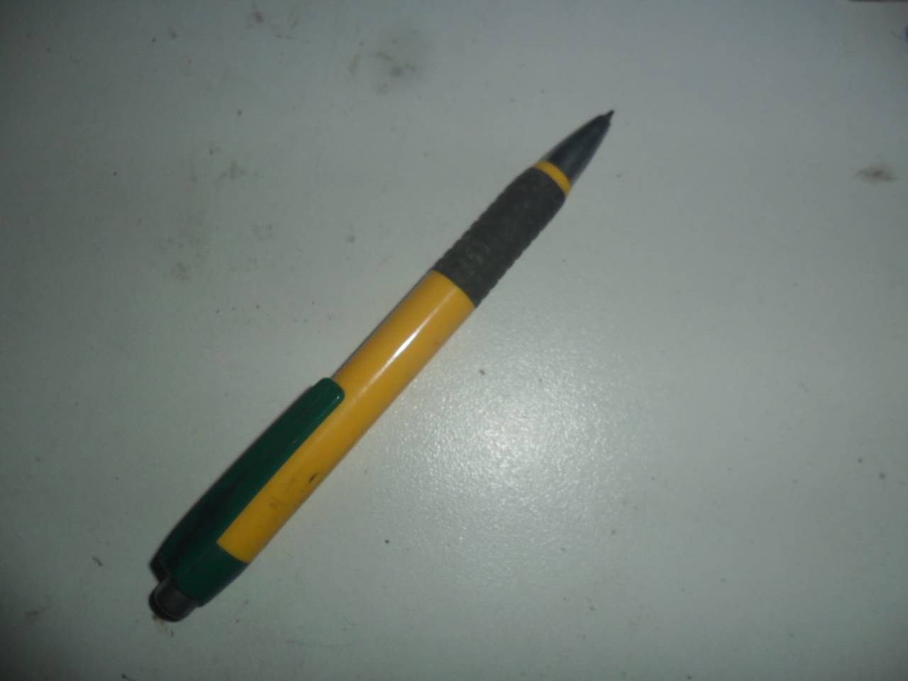 Caneta plástica, amarela e verde, possui prendedor metálico,
