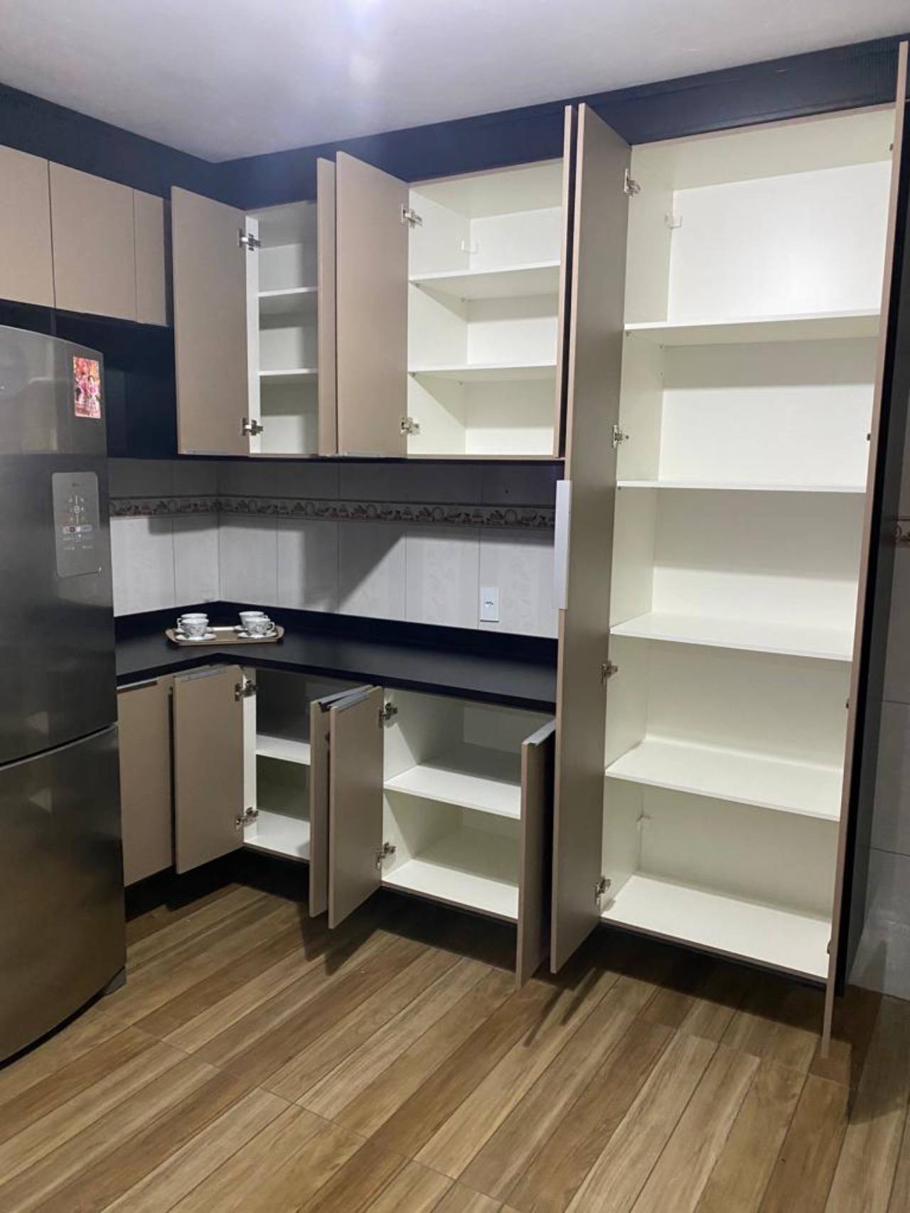 - Estilo: Várias opções de acabamentos, desde laca brilhante e fosca até texturas amadeiradas, permitindo a personalização do visual da cozinha conforme seu gosto e o design do ambiente.