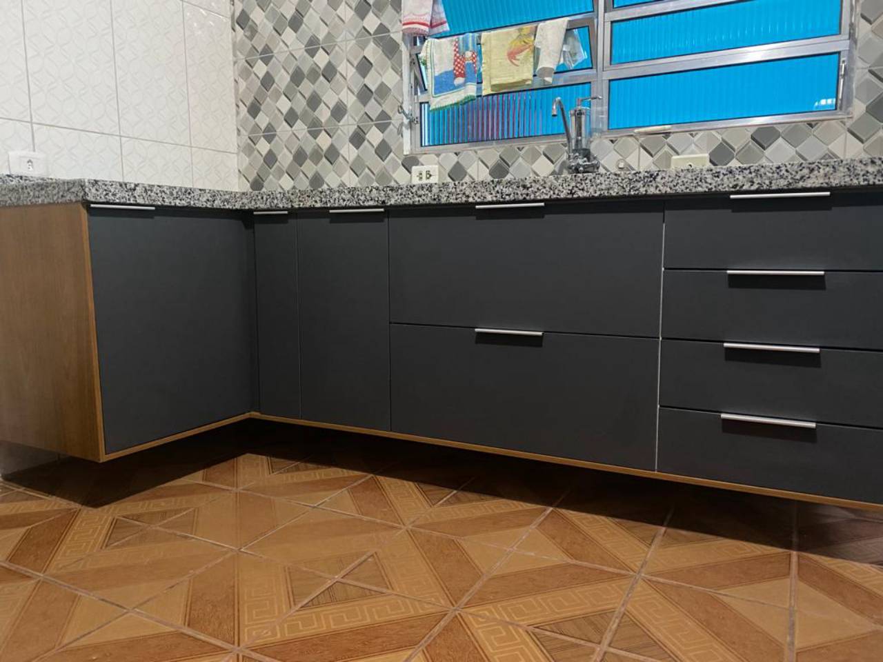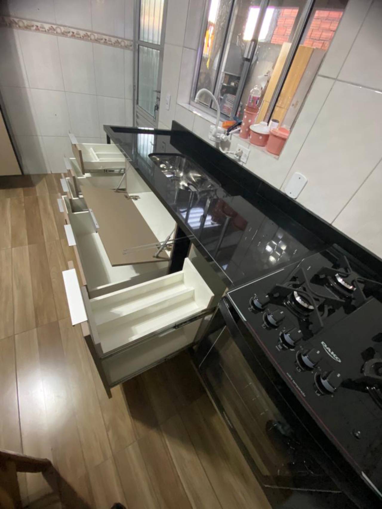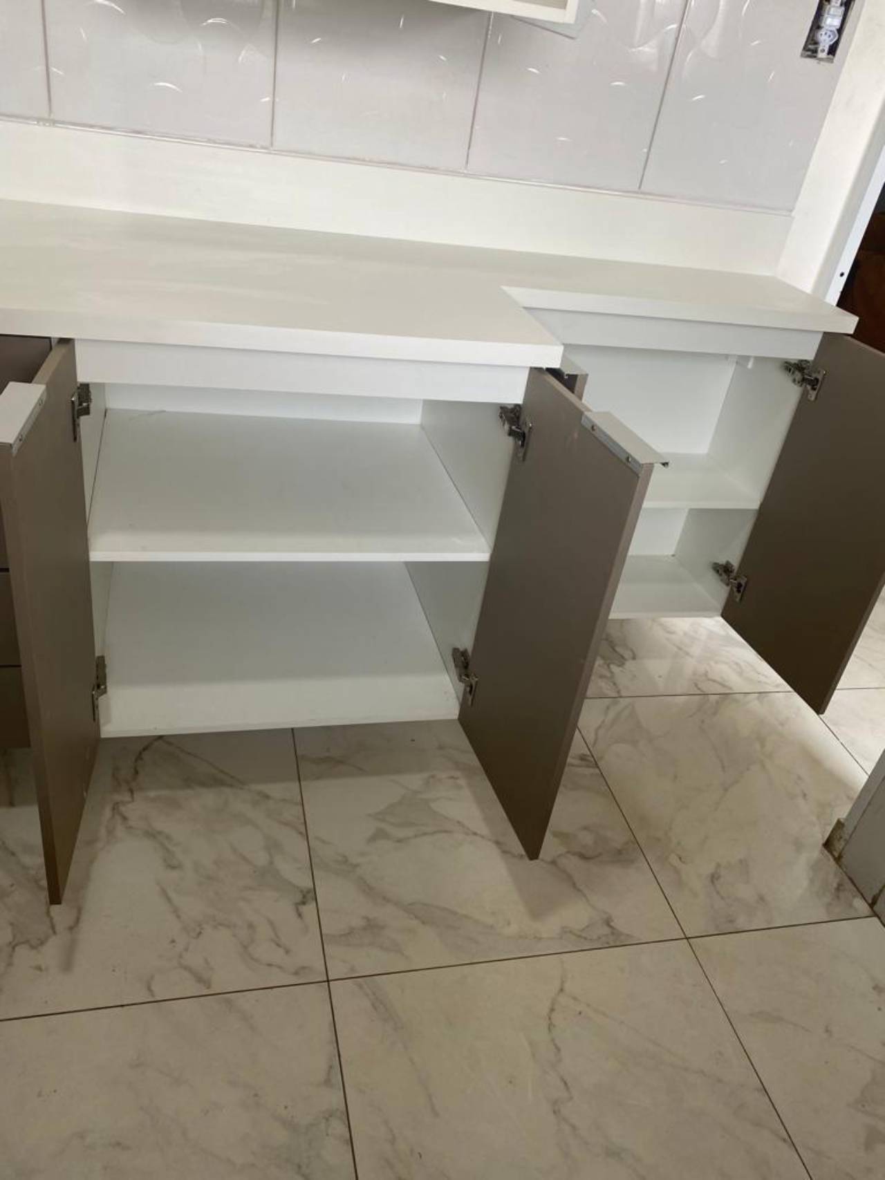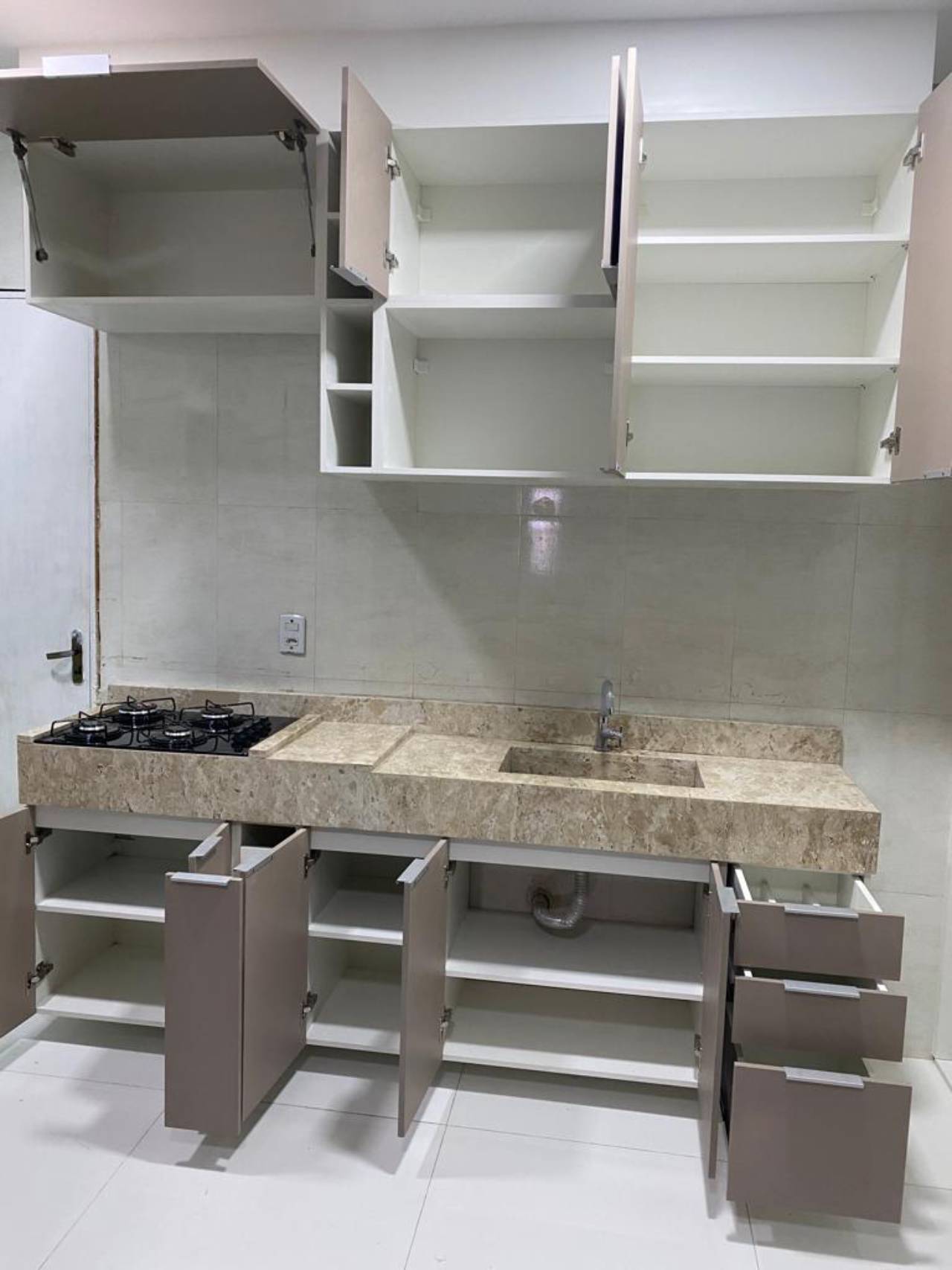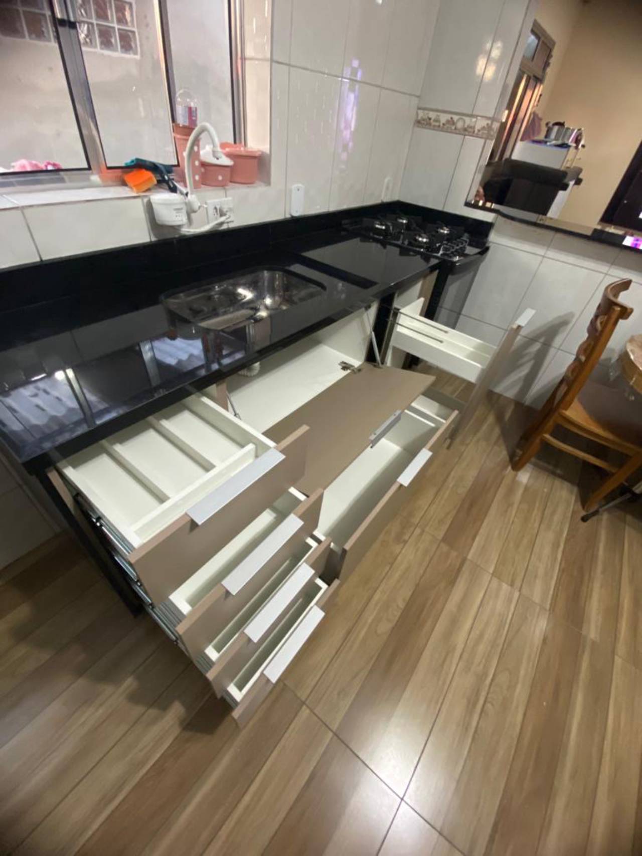 - Design Personalizado: Projetos sob medida que incluem armários superiores e inferiores, gavetas com divisórias internas, prateleiras ajustáveis, e bancadas em materiais como granito, mármore ou quartzo.