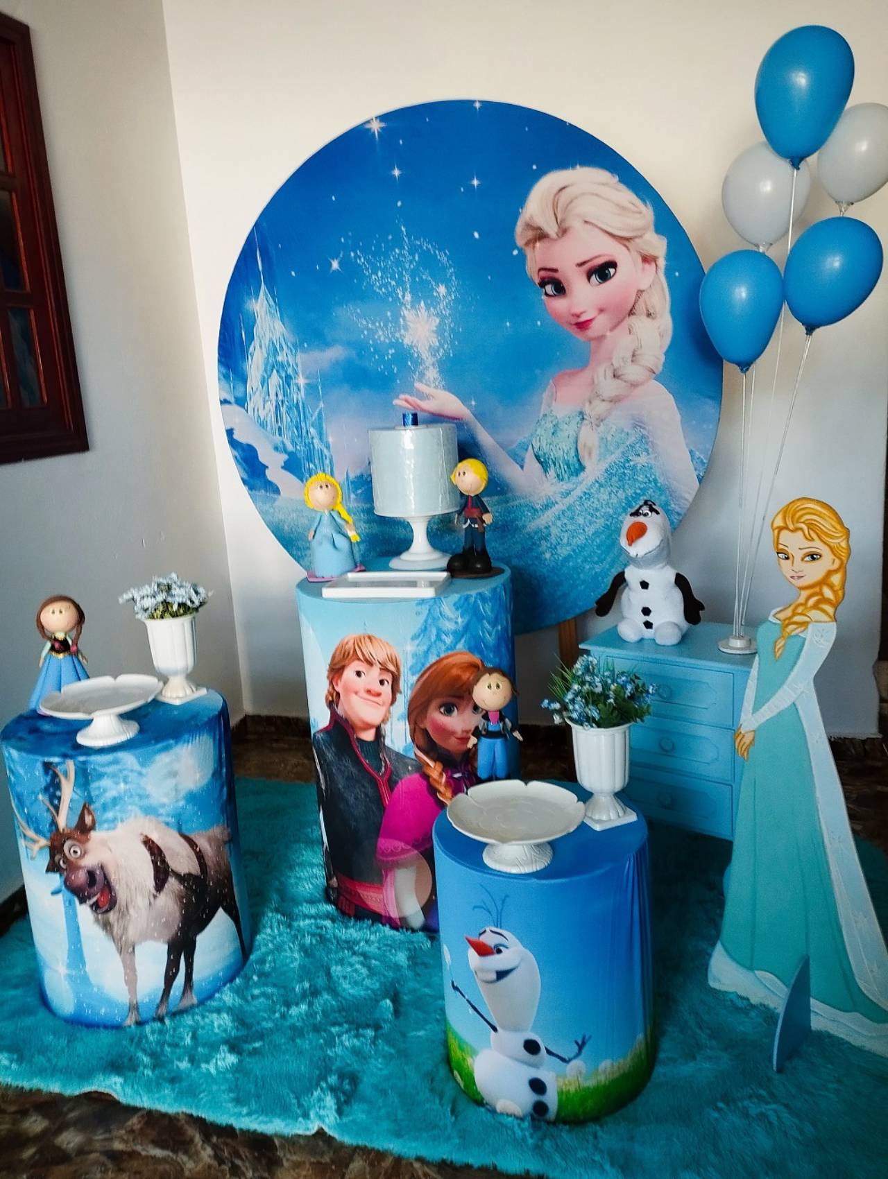 Com ele, você recebe todos os itens necessários para transformar o ambiente: painel redondo com capa sublimada, trio de cilindros com capas temáticas, criado azul, bolo fake, boleira, três bandejas de acrílico, bonecos ou displays de MDF, dois vasinhos com flores, display de chão, tapete de pelúcia e suporte para balão de mesa. Tudo chega limpo, higienizado e pronto para usar.